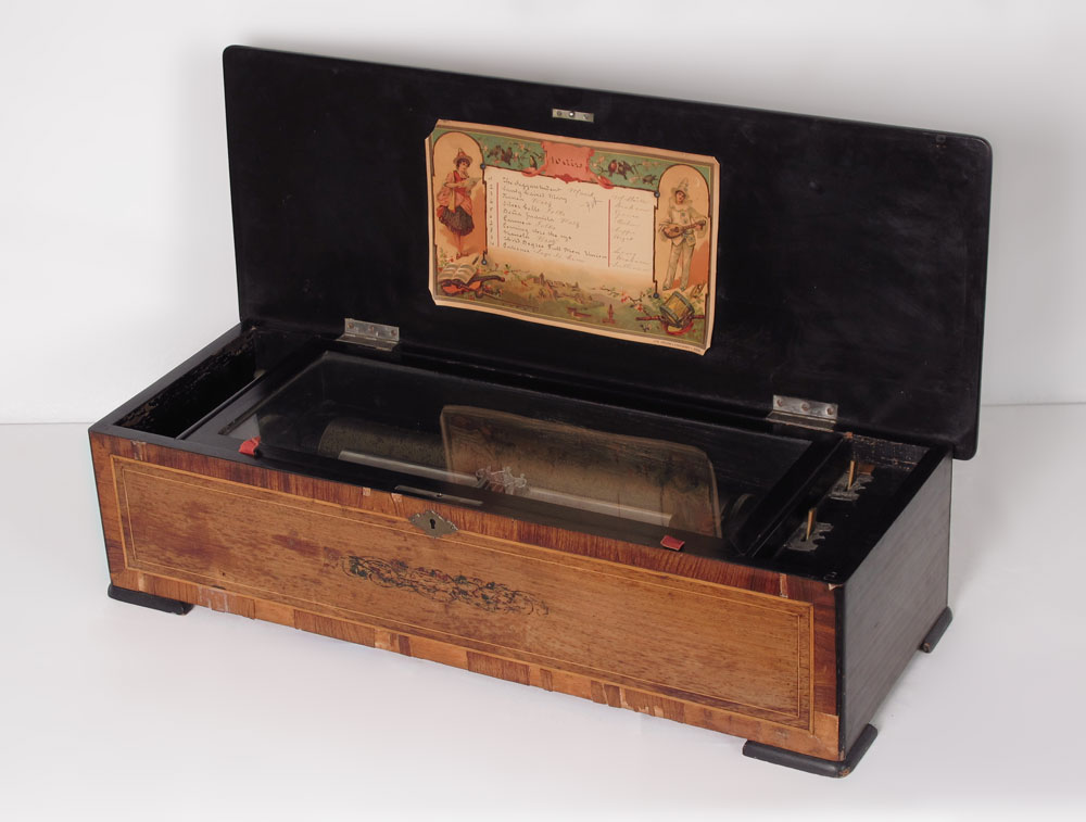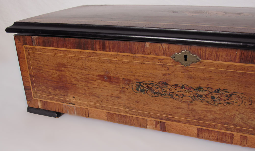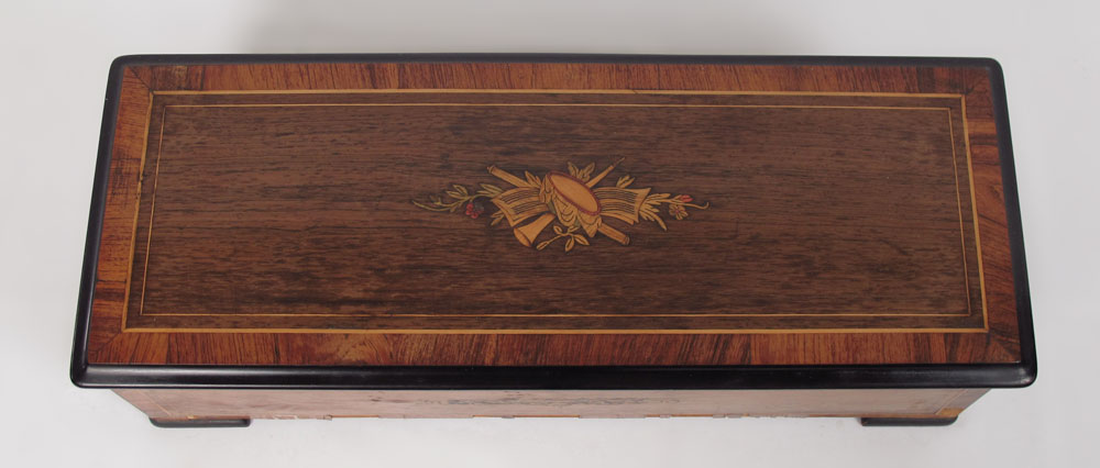 19TH CENTURY ROSEWOOD SWISS INLAID MUSIC BOX: Inlaid with musical instruments and string inlay. 10 song cylinder, comb has perfect teeth. Currently functioning and plays beautifully. No visible makers mark. 6 1/2'' h x 25'' w x 9 1/2.