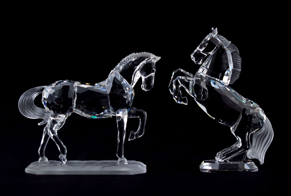 SWAROVSKI CRYSTAL FIGURINES: HORSES ON PARADE to include, ARABIAN STALLION 7612 000 002, Martin Zendron designer, issued 1998 retired 2006; and WHITE STALLION 7612 000 001, Martin Zendron designer, issued 1993 retired 2006.