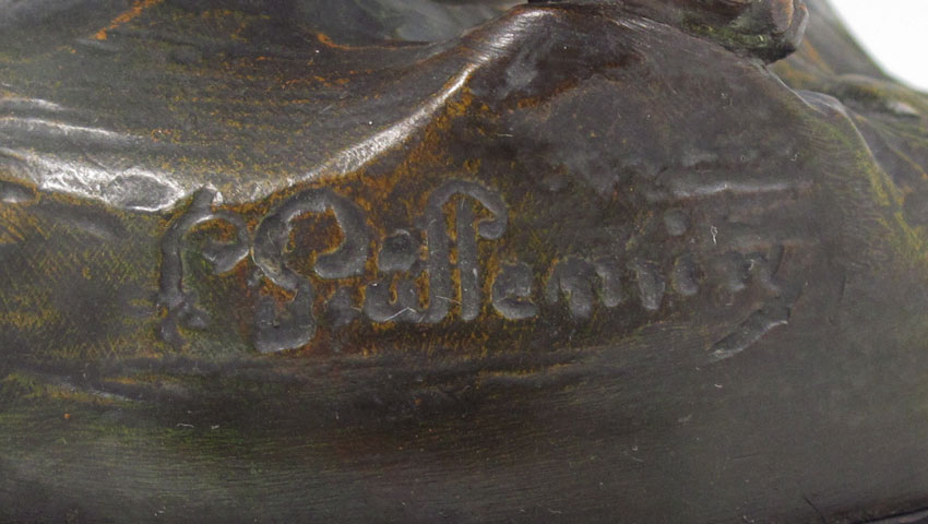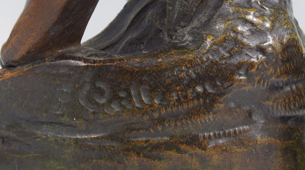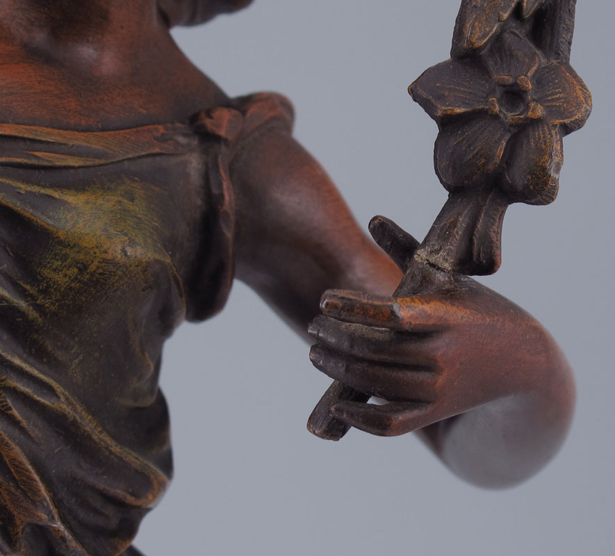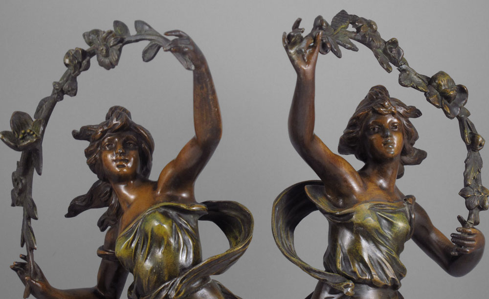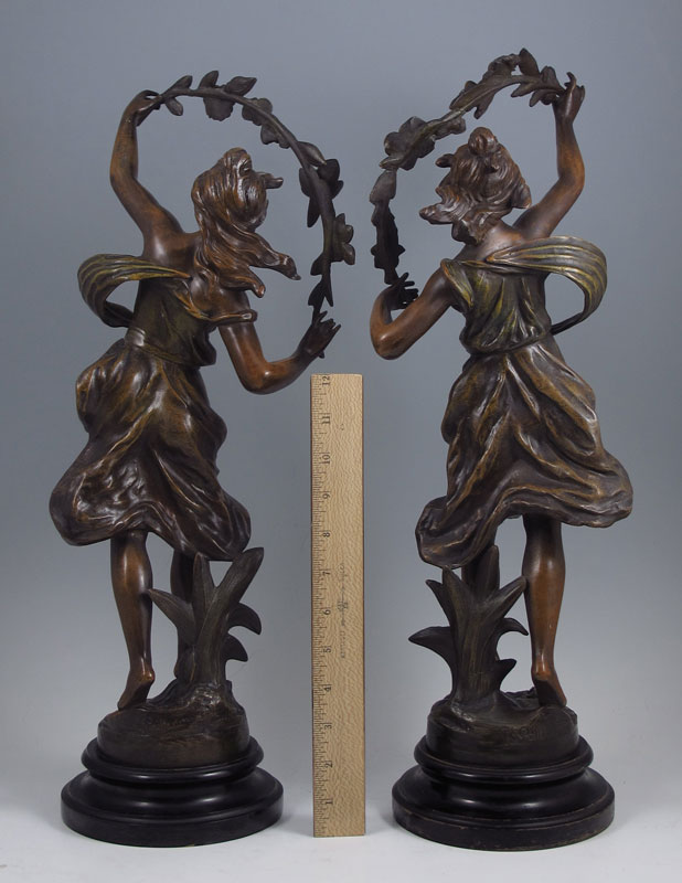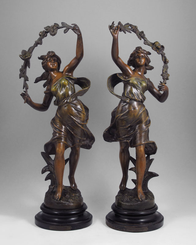 PAIR OF PATINATED METAL SCULPTURES AFTER GUILLEMIN: Depicting Nouveau young ladies dancing with foliate garlands, 18 1/2'' h, affixed to a painted beveled wood plinth, 20'' overall.