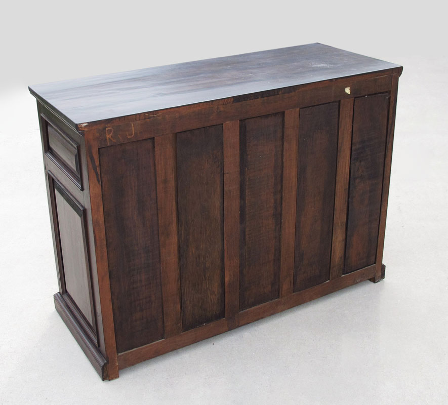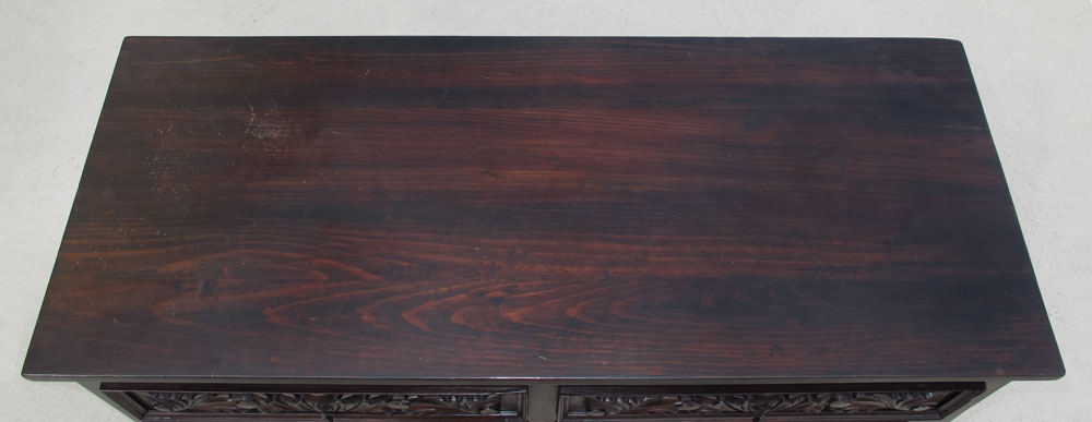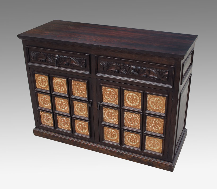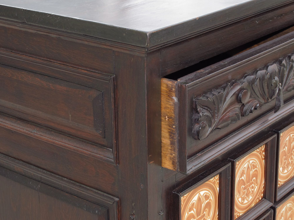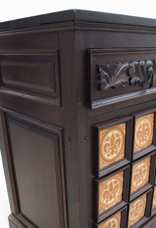 EARLY 20TH CENTURY TILED & CARVED SIDE CABINET: 2 drawers with applied carved decoration over 2 tile inset doors featuring fleur de lis and interior shelf. Tiles have been stained on backs to match interior of door. 36 1/4'' h. x 49 1/2'' x 20 1/2''.