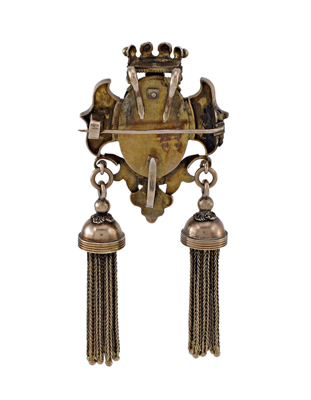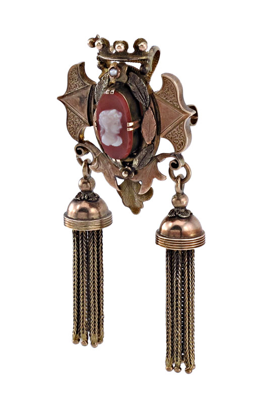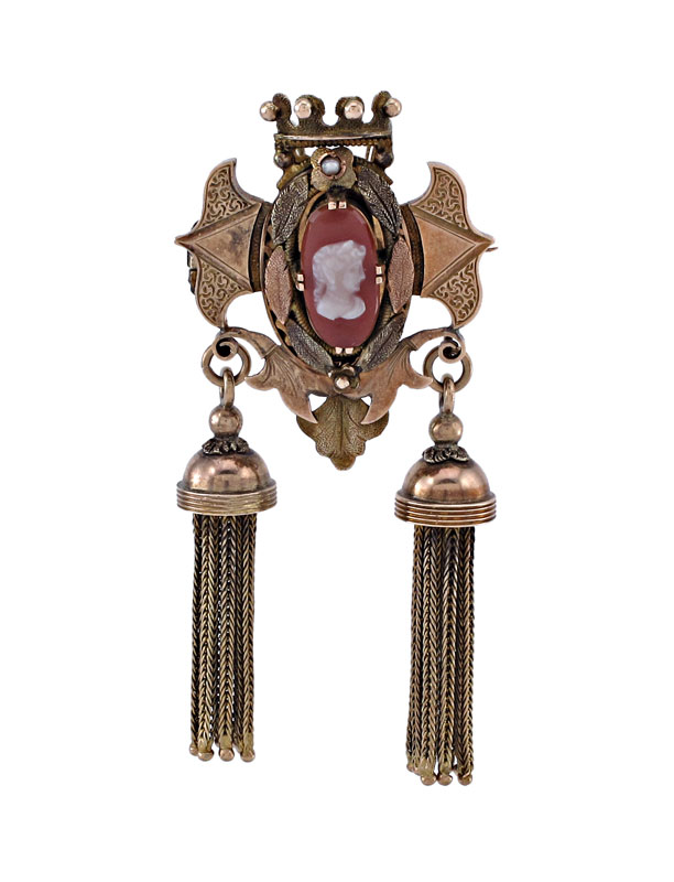 ANTIQUE 10K GOLD VICTORIAN BROOCH/PENDANT: 10K yellow gold Victorian Brooch/pendant. Crest and crown with hardstone cameo in center. Two foxtail tassels. Bar pin closure. Double bail and watch hook. Weight: 21.3 grams. 3'' in length.