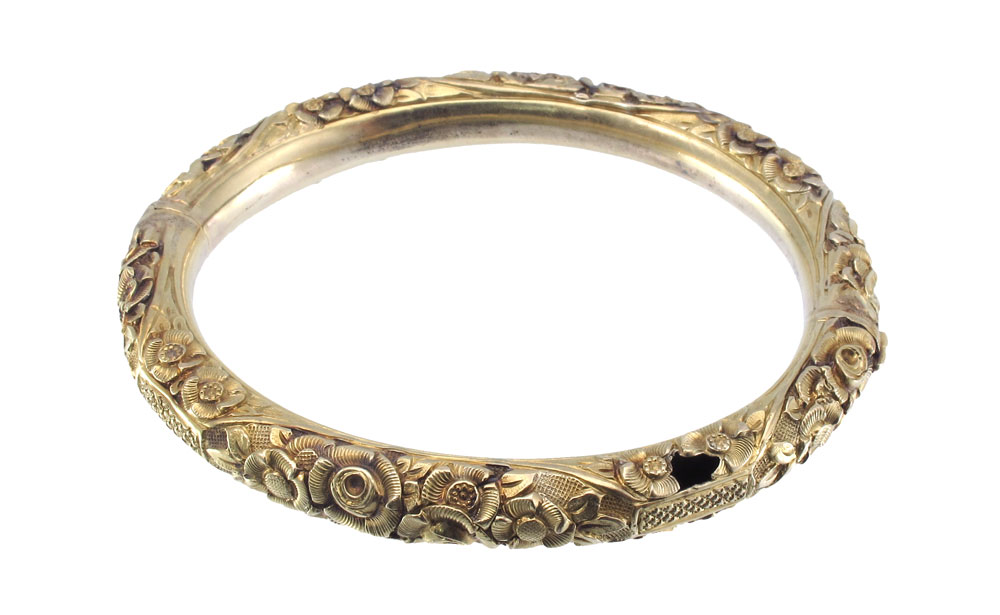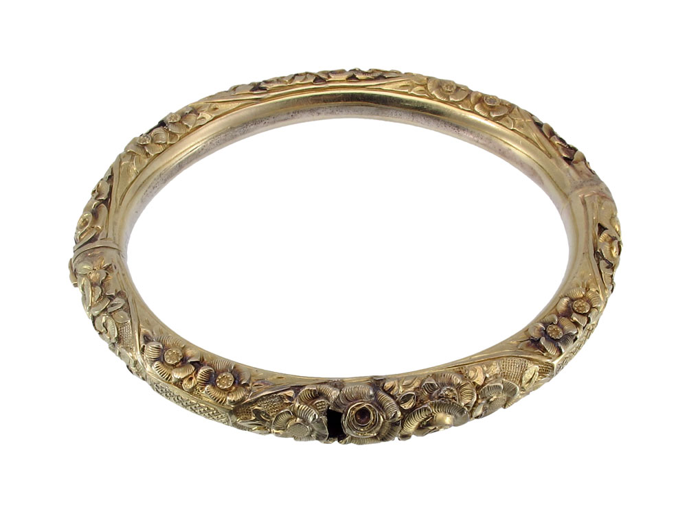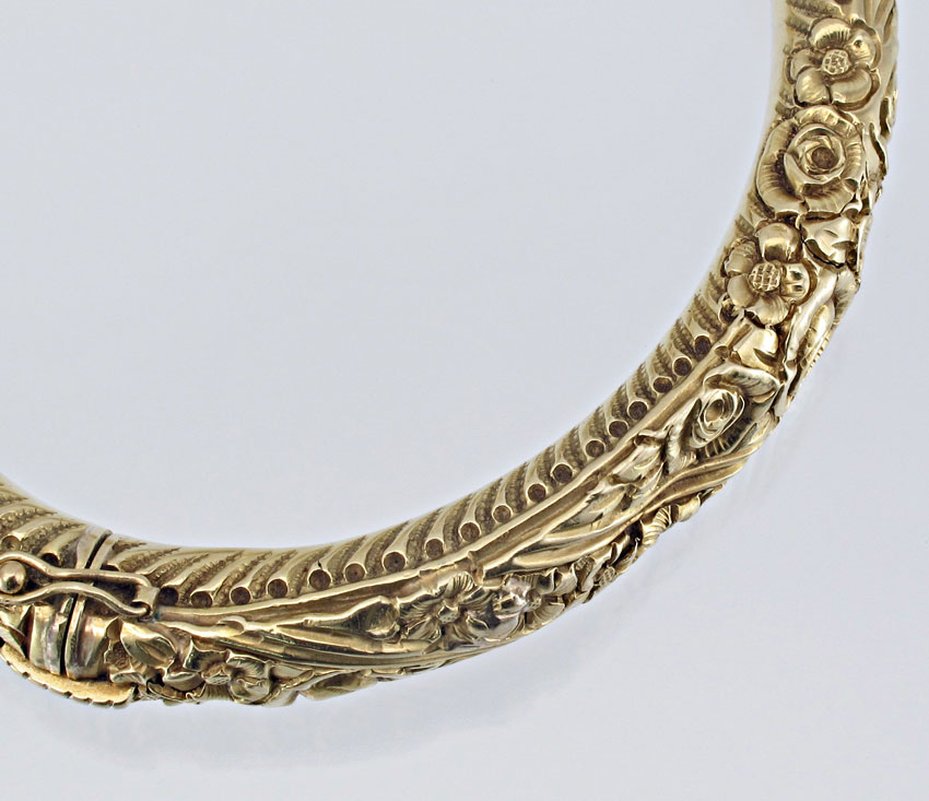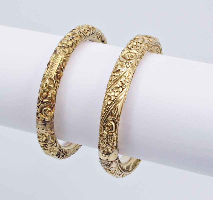 PAIR OF 18K GOLD ANTIQUE BANGLE BRACELETS: Pair of 18K yellow gold bracelets. Hollow with repousse floral designs. One bangle has two holes. Hinged with figure eight safety clasps. Weight: 35.7 grams.