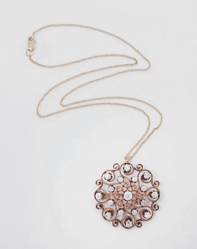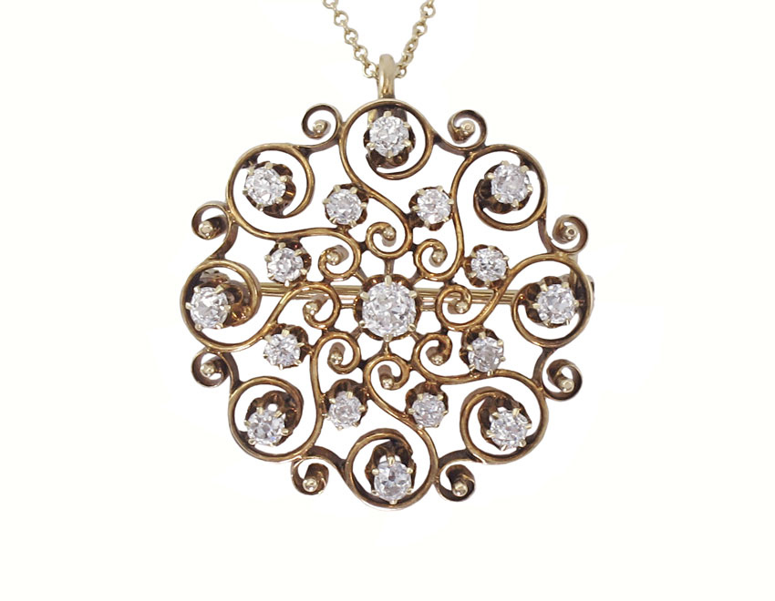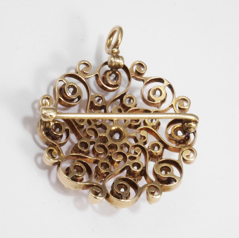 ANTIQUE 14K GOLD DIAMOND BROOCH/PENDANT: 14K yellow gold pin shows off 17 old mine cut diamonds, approx. 1.5 Ctw., averaging VS in clarity and G-H color. The diamonds are prong set. Swivel bale. Dia. 1.25''. Sold with a 14K gold chain (1.5 gr). Pendant Weight 8.6 grams. Sold with current Atlanta Diamond Appraisers GIA graduates appraisal for $3,200.