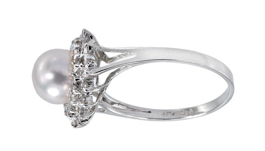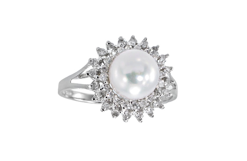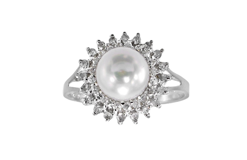 14K GOLD DIAMOND AND PEARL RING: 14K white gold ring contains 40 round single cut diamonds of approx. .33 Ct. The diamonds average VS in clarity and H-I in color. At the center is one 7.50 mm cultured pearl. White in color. Very high luster. The diamonds are prong set. The pearl is peg and epoxy set. Weight: 2.5 grams. Size: 7