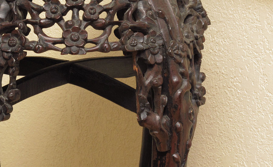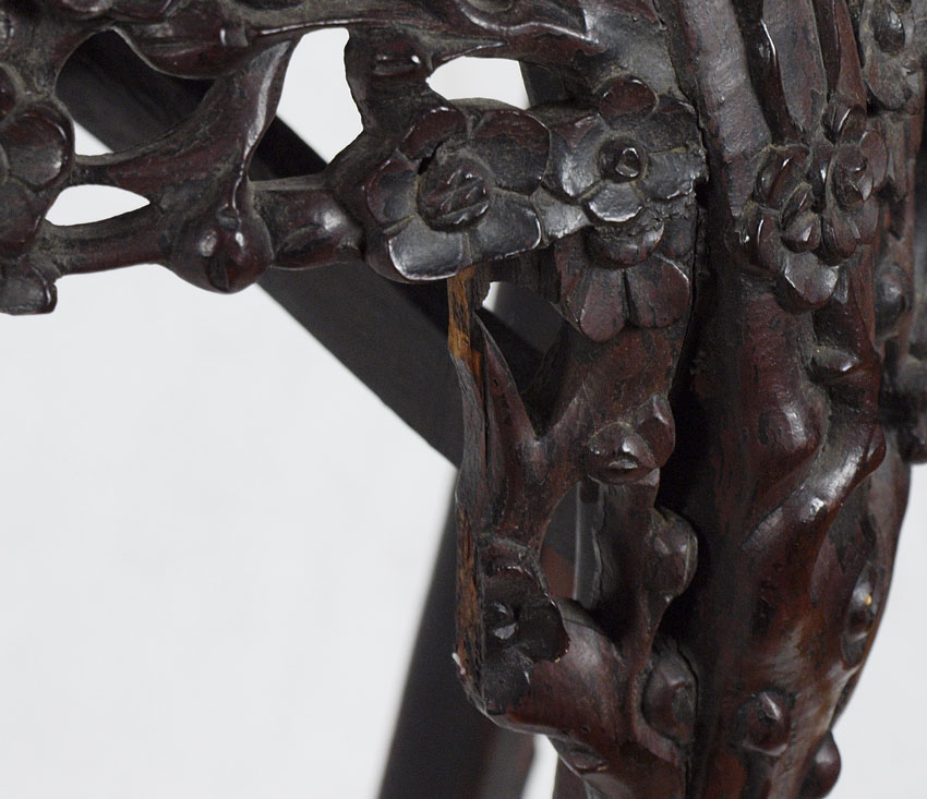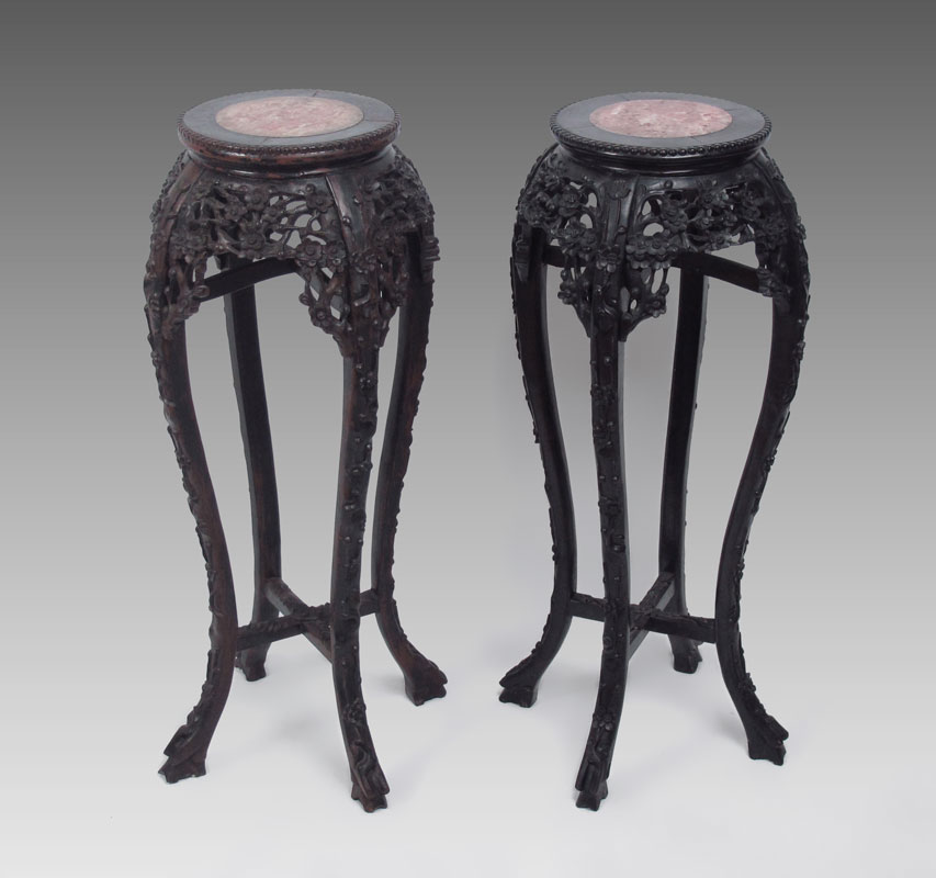 PAIR CHINESE CARVED JARDINIERE STANDS: Almost an exact pair, one has more wear to the finish. Red marble inserts, 36 1/2'' x 10 7/8'' h. x 11'' dia. top, 15 1/2'' dia. at the knees.
