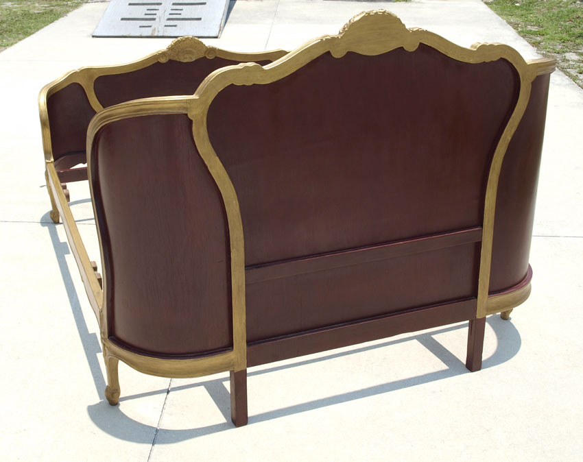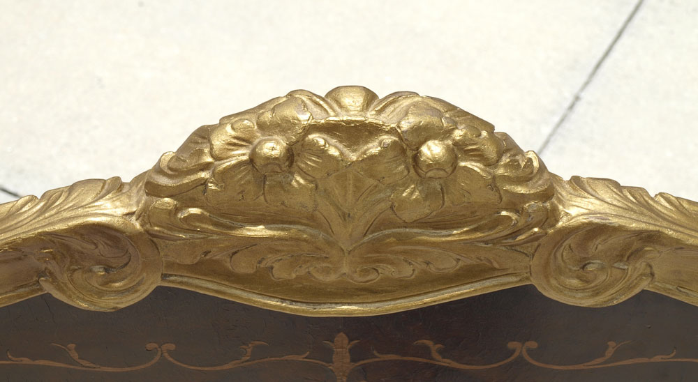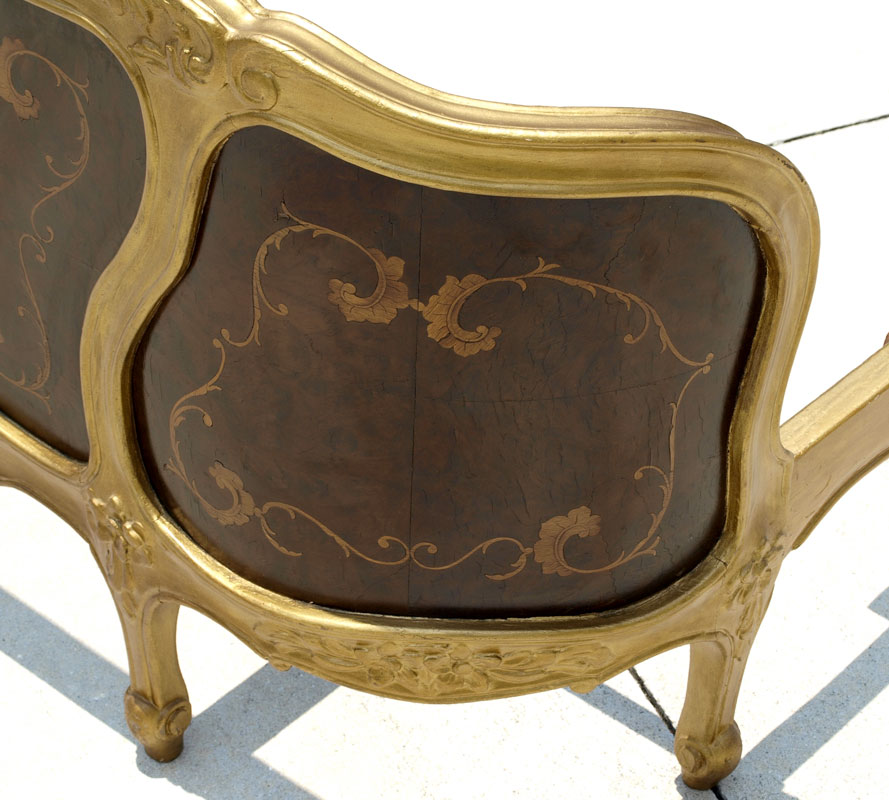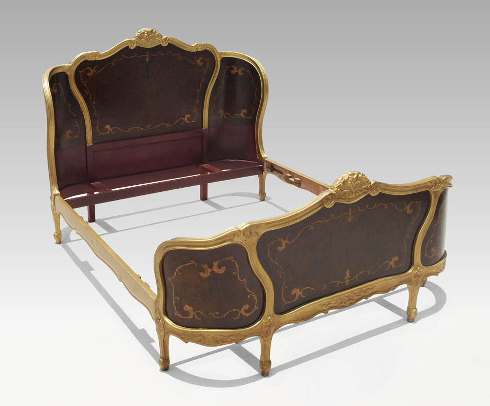 ORNATE FRENCH STYLE GOLD PAINT DECORATED BED: Gold paint decorated carved crest, trim and feet with foliate inlay in panels on headboard and footboard. Full or double size, interior space 57'' x 77''. Headboard measures 47 1/2'' h. x 59'' x 10 1/4'', Footboard 30 1/2'' h. x 10 1/4''.