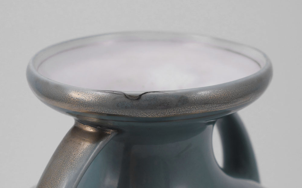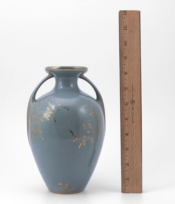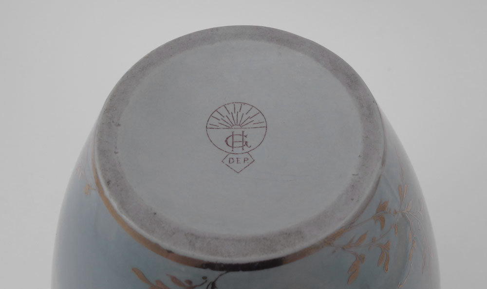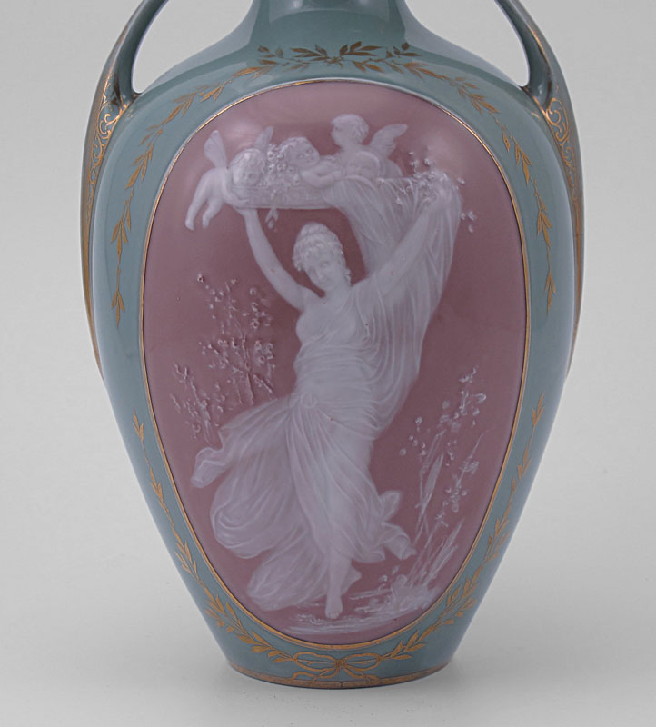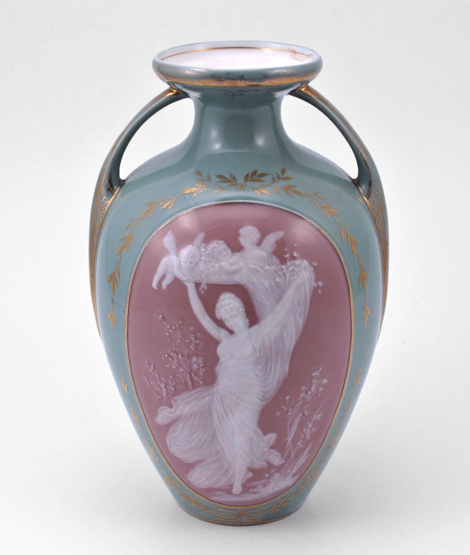 GEBRUDER HEUBACH PATE-SUR-PATE VASE: Double handled vessel in a baluster form with Greek maiden and cupids in basket. Gilt floral garland decoration. Red Gebruder Heuback initials under sunburst mark. 8 1/2'' h. x 5 1/4''.