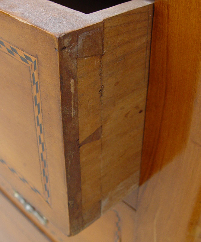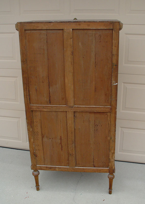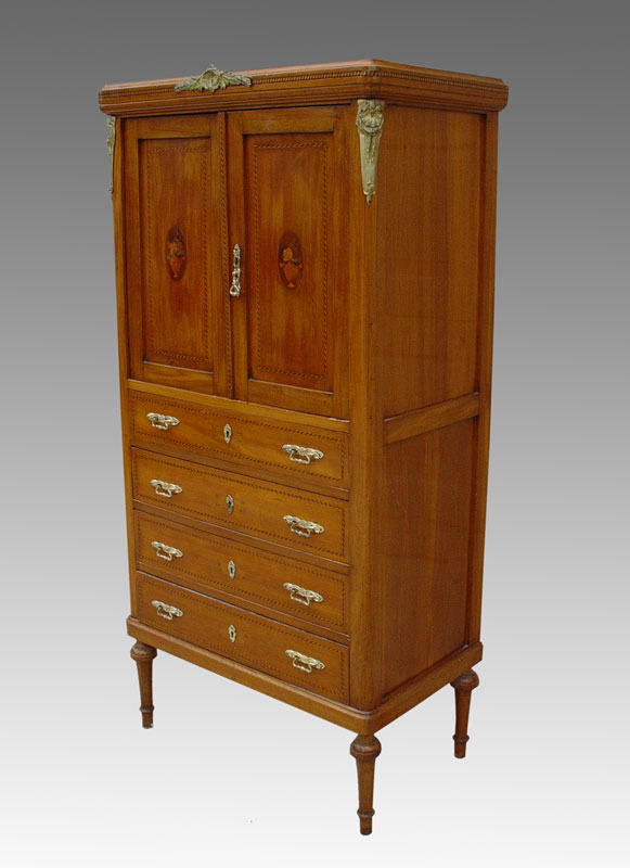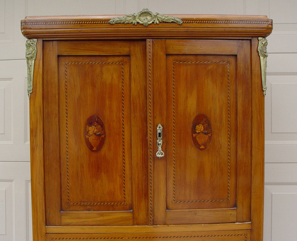 FRENCH SATIN WOOD ORMOLU MOUNTED LINEN PRESS: 2 doors with interior shelf over 4 drawers with marquetry and parquetry inlay on doors, parquetry inlay on drawers and top edge trim. 65'' h. x 32'' x 18''