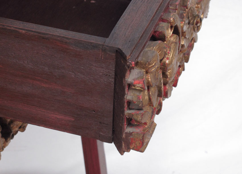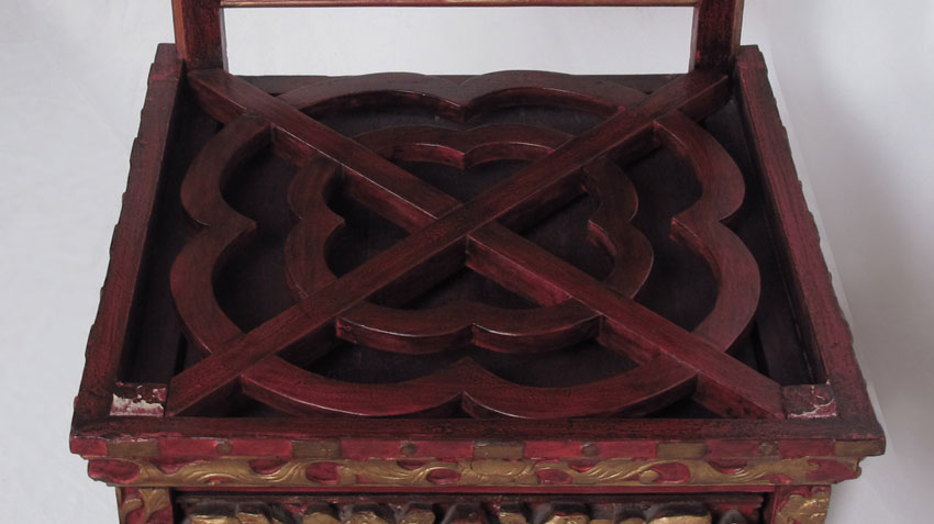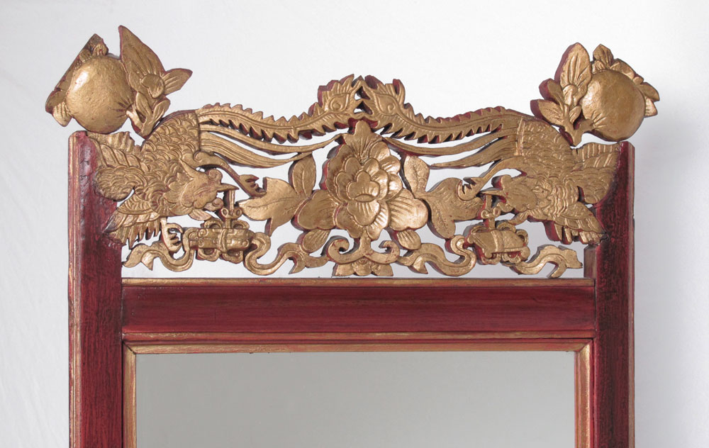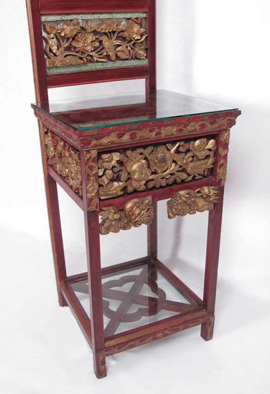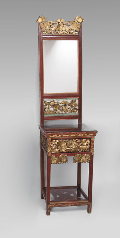 CHINESE CARVED, GILT WOOD WASH STAND: Gilt and carved wood. Mirror over one drawer. 2 pierce carved tiers fitted with glass. Approx. 71''h, 17 3/4''w x 17 1/2'' deep.