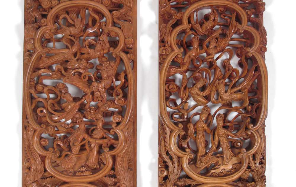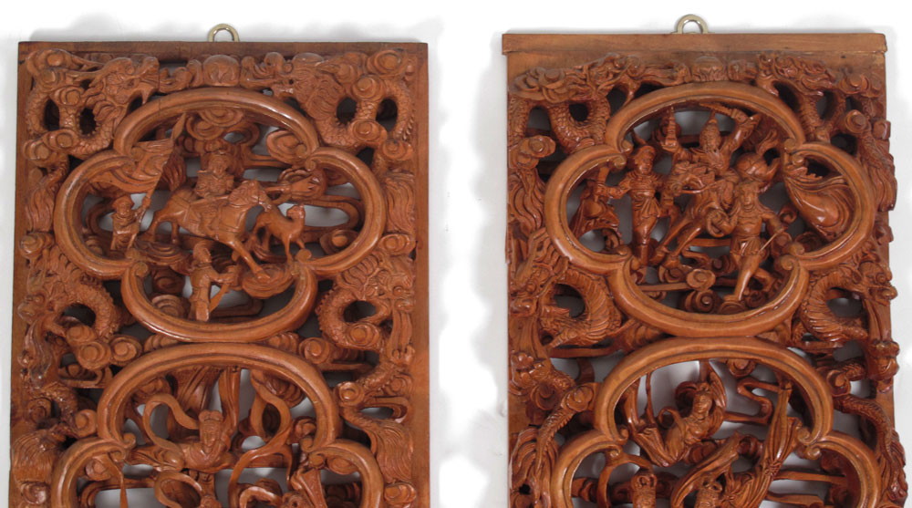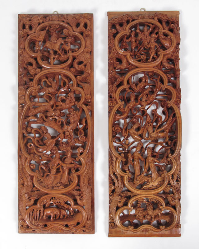 PAIR CHINESE CARVED PANELS: Elaborately carved with similar but not identical relief carved featuring warriors, maidens, dragons, birds and more. Each panel 33'' h. x 11'' x 2'' deep.