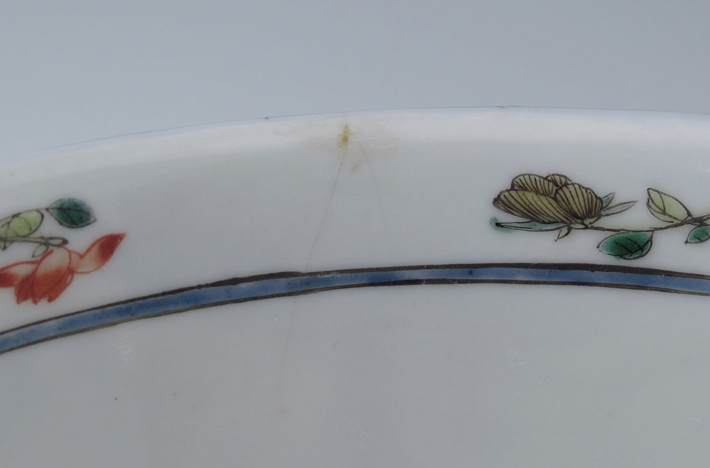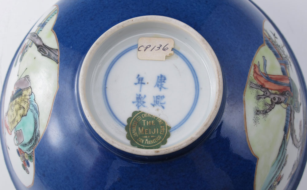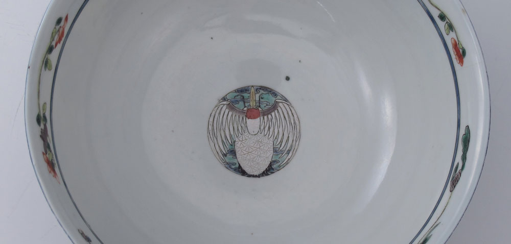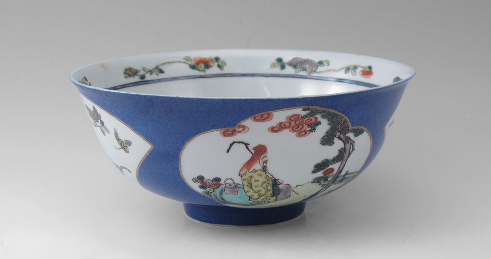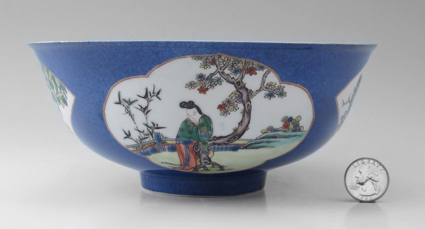 CHINESE EXPORT DEEP BOWL: Blue ground with scenic reserves with figures, signed in character. The interior with central image of crane in flight. 3 1/4'' tall x 8'' dia.