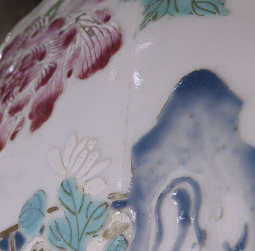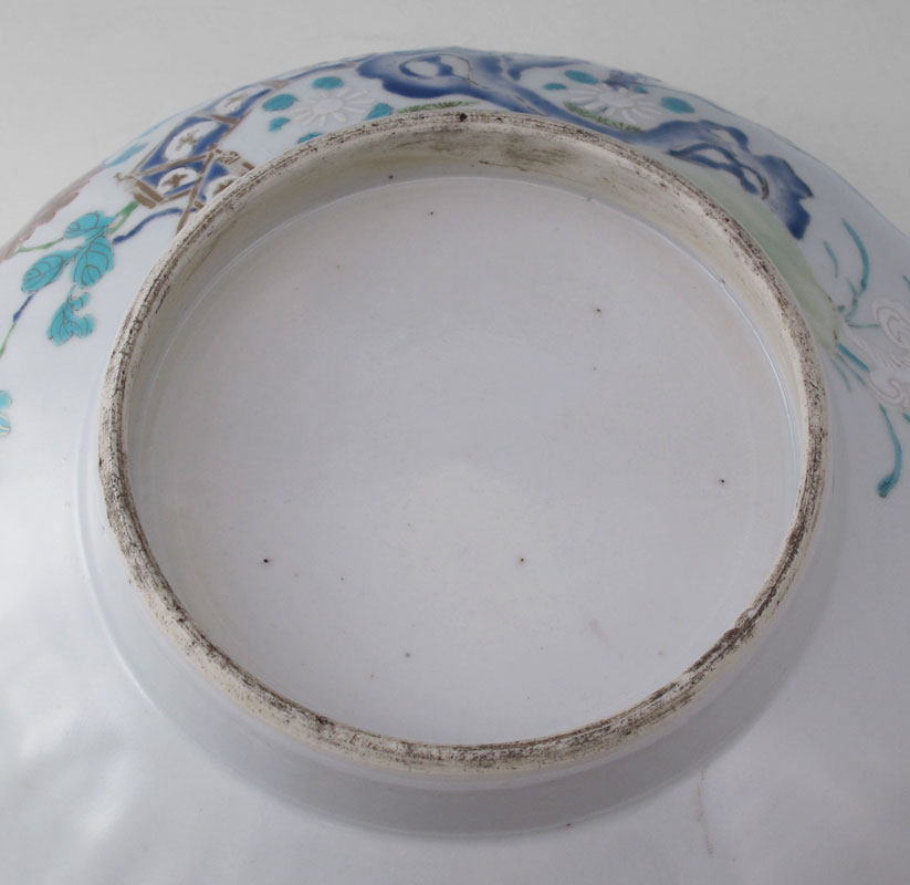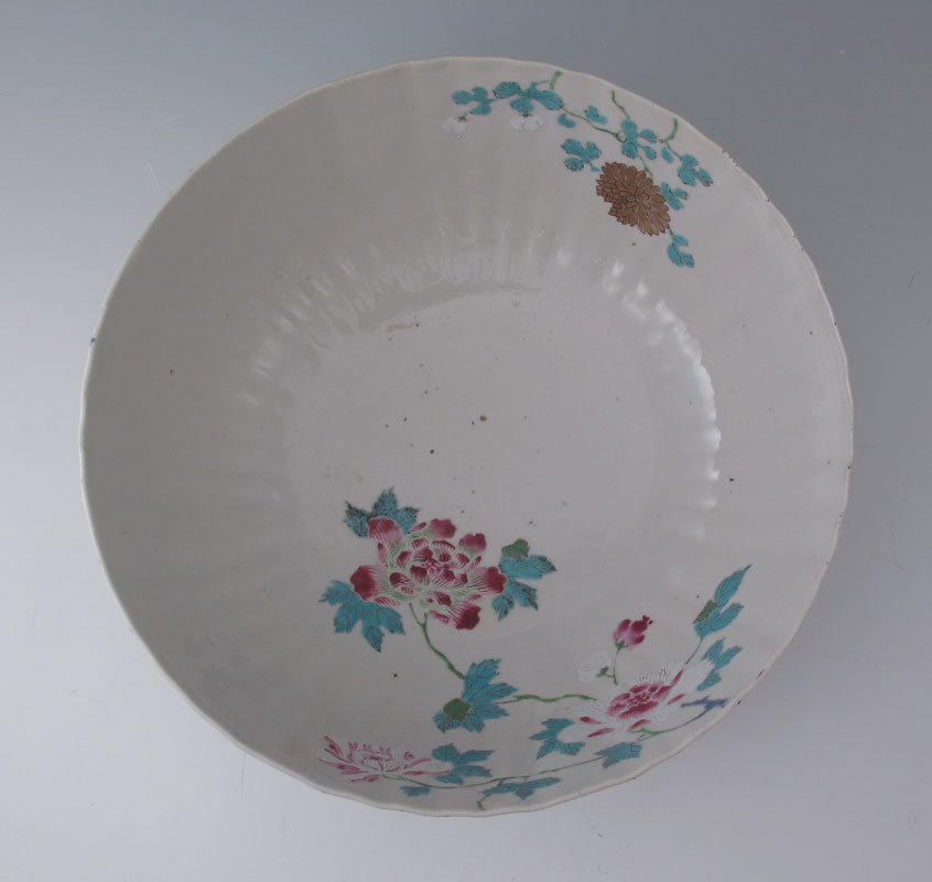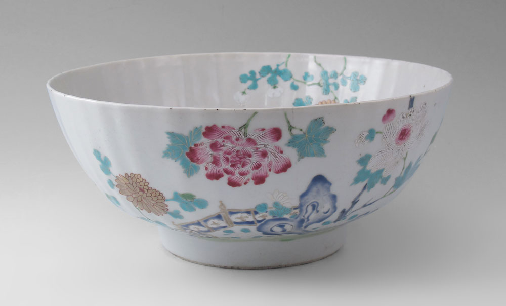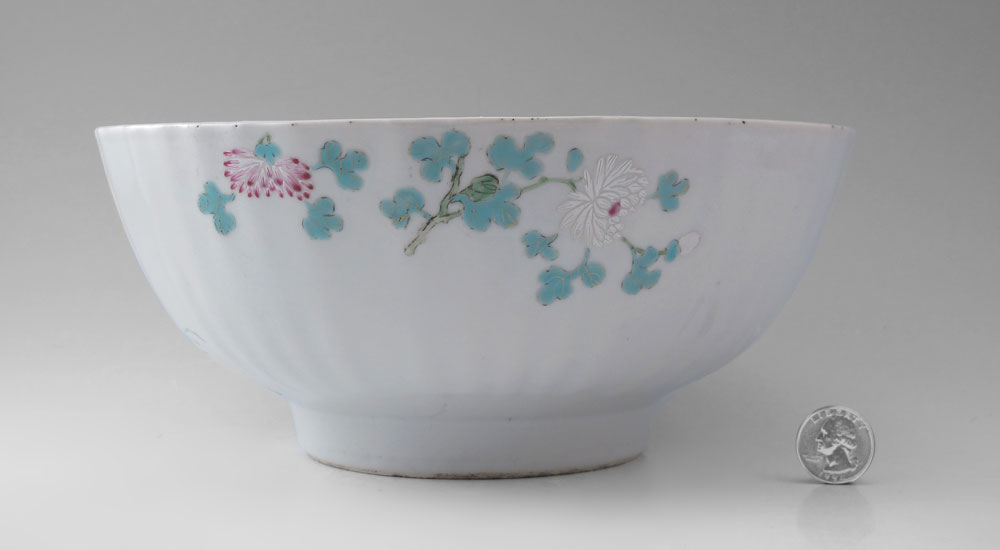 CHINESE EXPORT FLORAL DECORATED DEEP BOWL: Slightly ribbed bowl decorated in Prunis and Chrysanthemums, exterior and interior. 4 1/2'' h x 10'' dia.