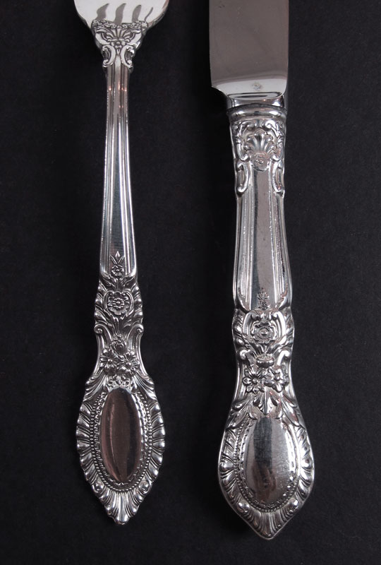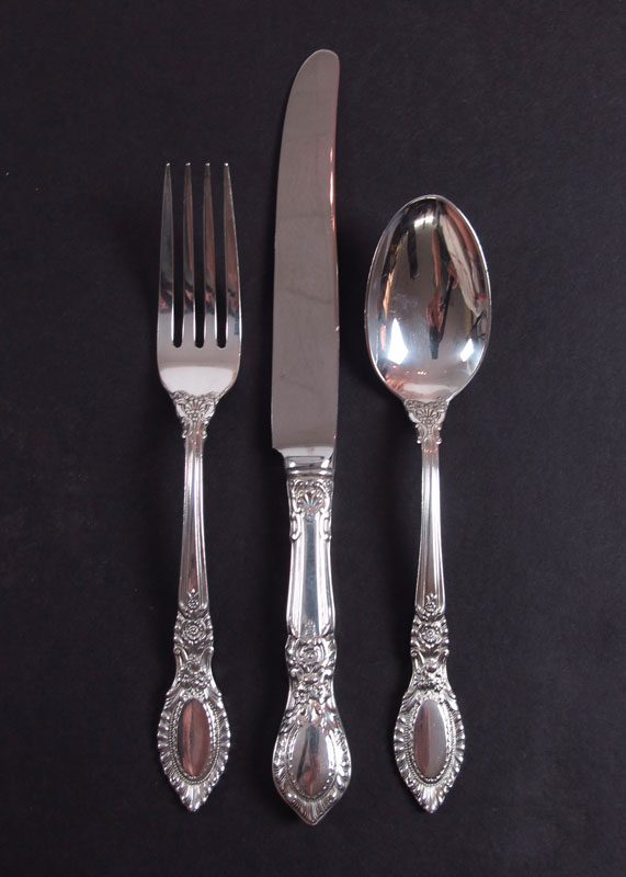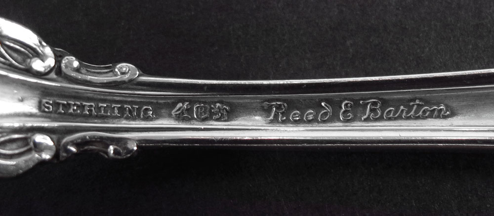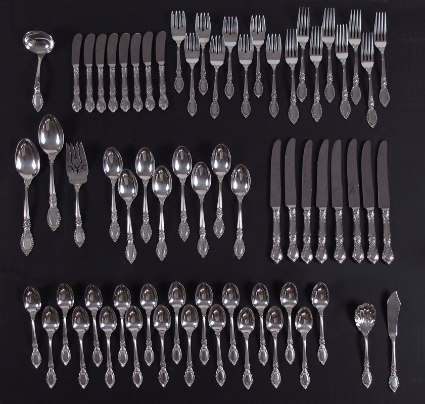 REED & BARTON GUILDHALL STERLING FLATWARE SERVICE: Approx. pieces in the Guildhall pattern by Reed & Barton to include 8 forks (7''), 8 salad forks (6 1/8''), 21 teaspoons (6''), 8 soup spoons (6 3/4''), 8 hollow knives (9''), solid master butter knife (7 1/8''), 7 hollow butter knives (6''), 2 tablespoons (8 1/2''), sauce ladle (5 7/8''), sugar scoop (7 1/2''), serving fork (7 1/2''). No monograms. Approx. 75.5 troy oz.