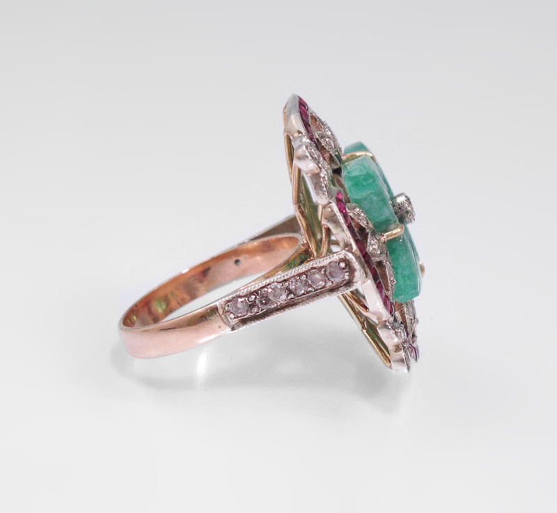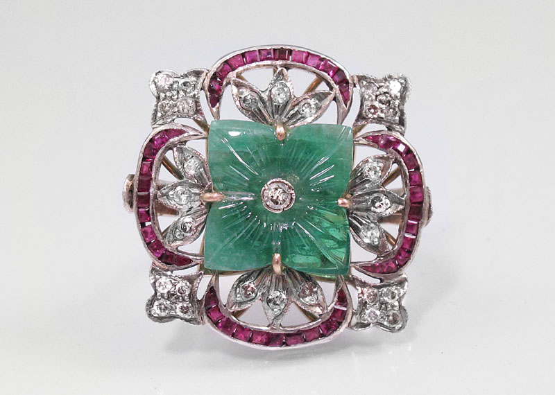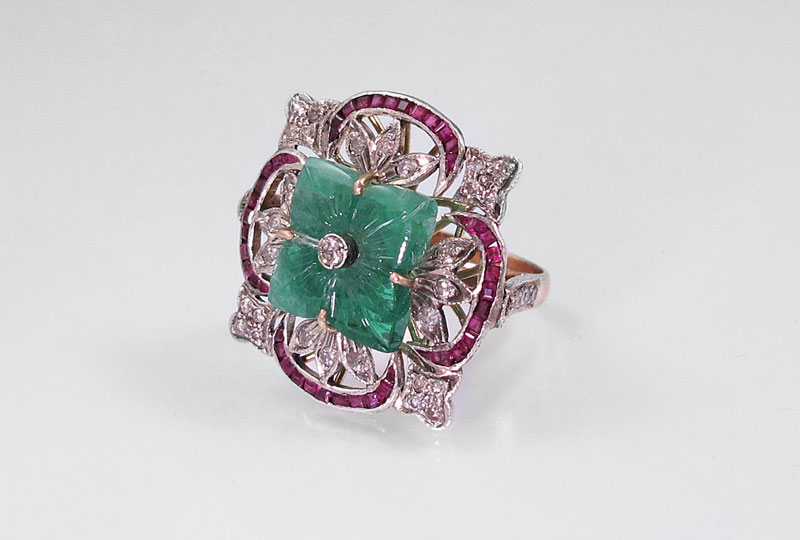 EMERALD, DIAMOND, RUBY & 14K GOLD RING: 14K yellow gold ring contains one carved emerald tablet with floral motif. Diamonds and rubies frame the emerald. 29 round full cut diamonds. Weight: .60 Ct. Approx. Rated I1 in clarity and Top Light Brown in color. Forty four square calibr‚ cut rubies. The emerald and diamonds are prong set. The rubies are channel set. Weight: 8.3 grams. Size: 7
