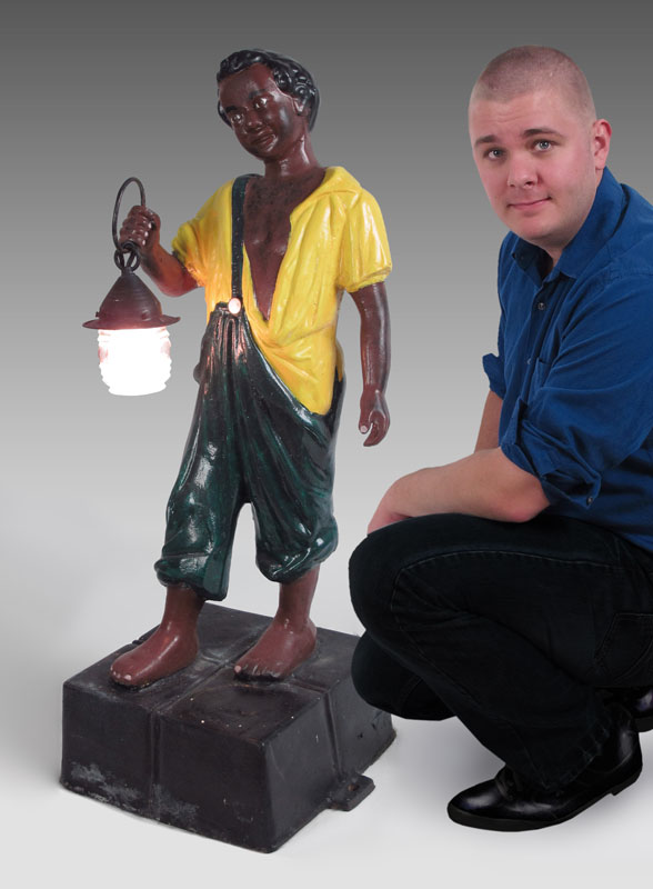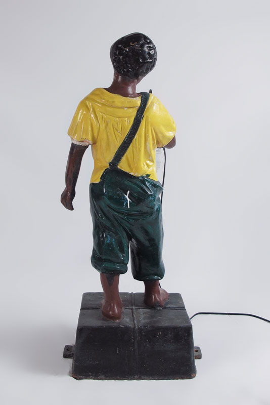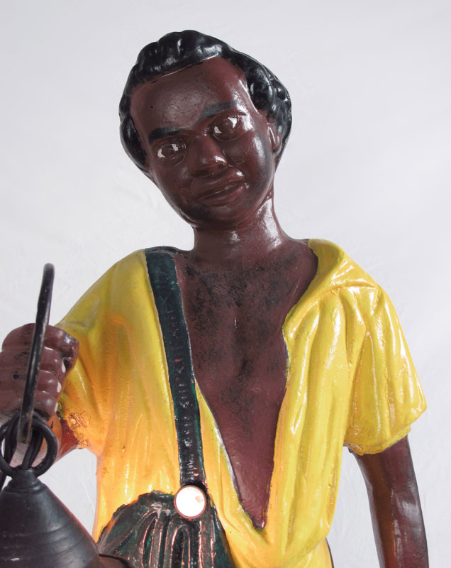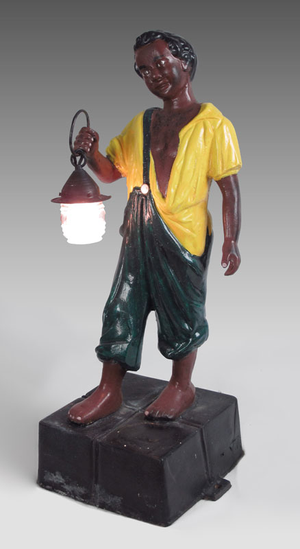 CAST IRON BLACK SLAVE LAWN JOCKEY WITH LANTERN: Figural black child with slave apparel holding electric lantern. Repainted, unmarked. 42 1/2'' x 18 1/2'' x 14 1/2''.