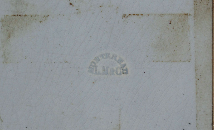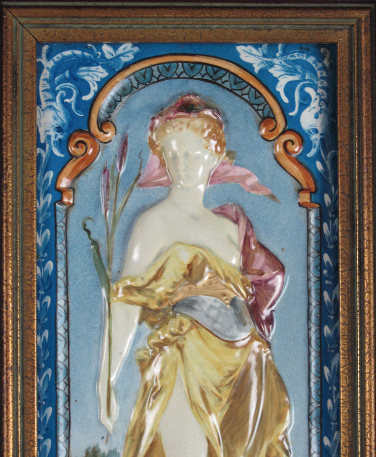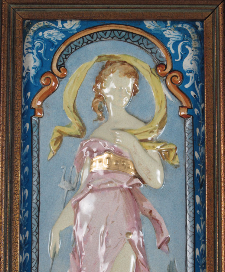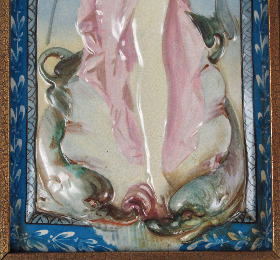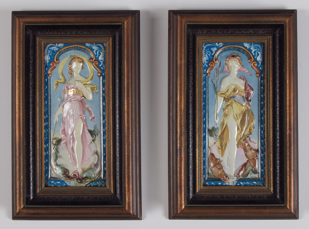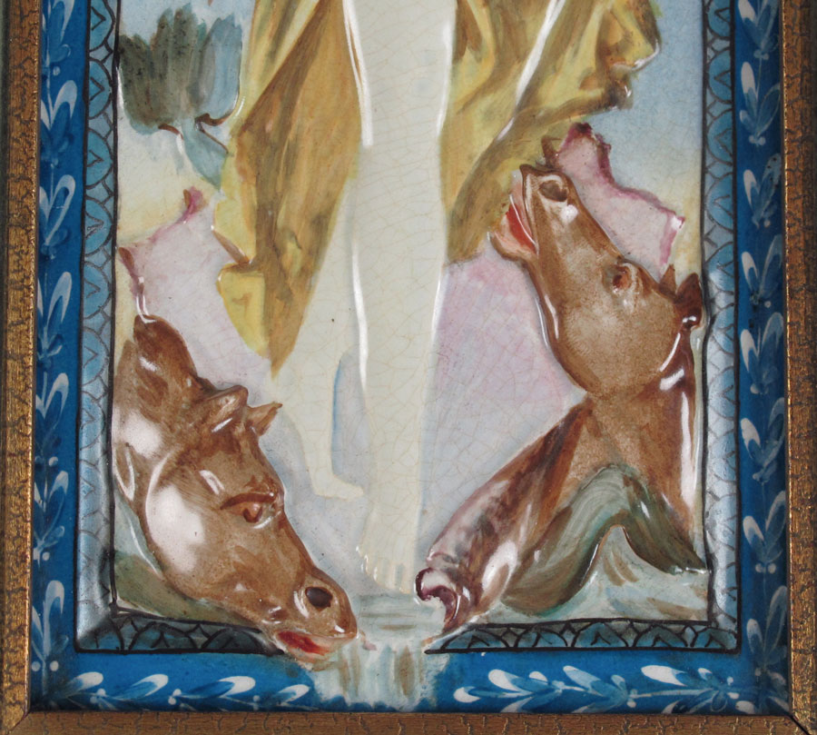 TWO MONTEREAU FRENCH BAS RELIEF TILES: Images of classically robed maidens, one with horses at her feet, the other with dolphins. Impressed Montereau L.M & C. Mounted in crackle finish wood frames. Ties measure approx. 11 1/2'' x 6'', framed 16'' x 9 7/8''.