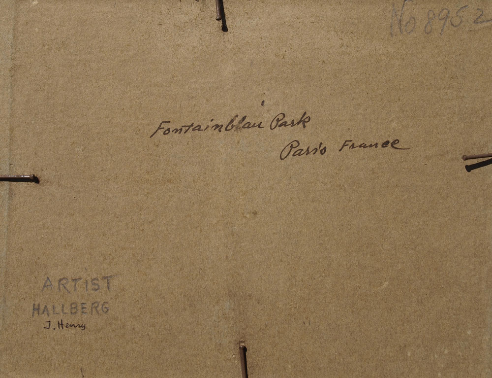 HALLBERG, J. Henry, (American, 20th C): ''Fontainbleu Park, Paris, France'', Oil/Canvas Board, 8'' x 10'', signed lower right, titled verso, also titled in the lower left corner, painted frame with wear, 12 1/2'' x 14 1/2''.