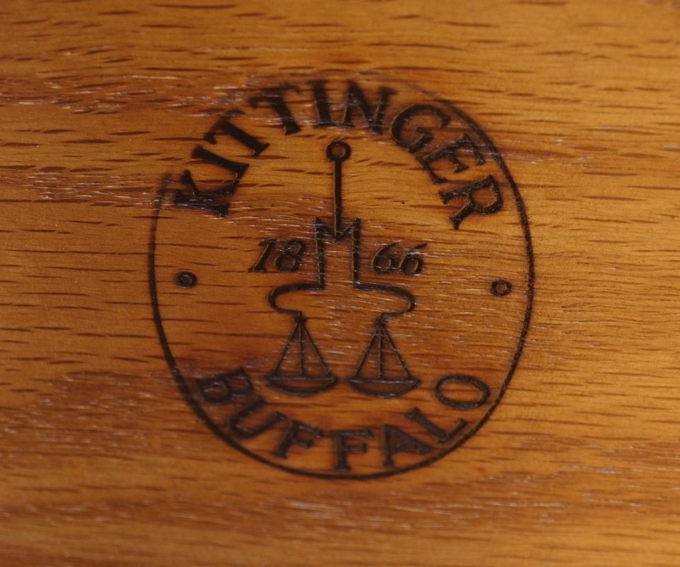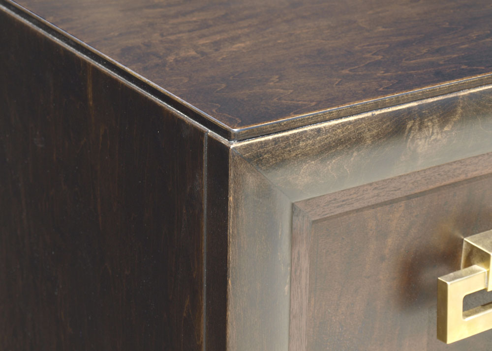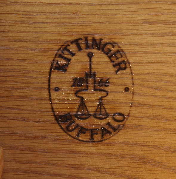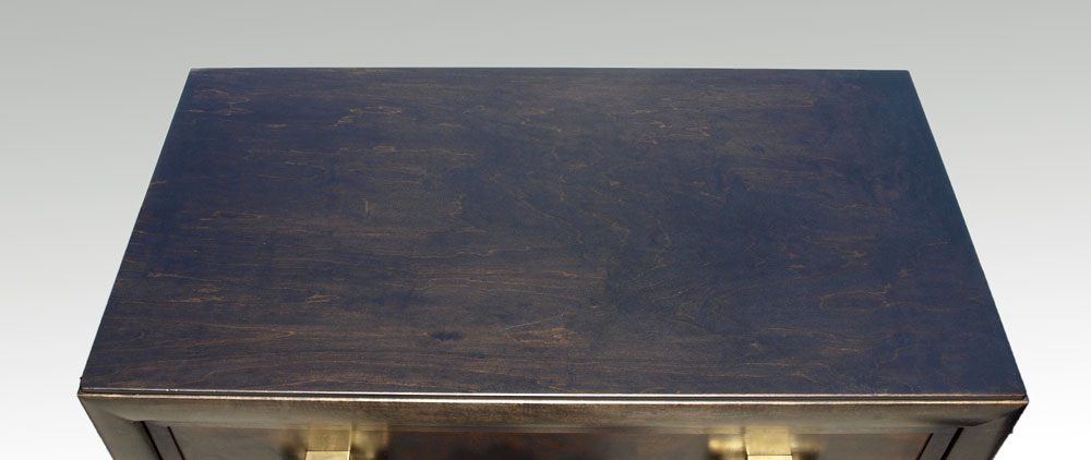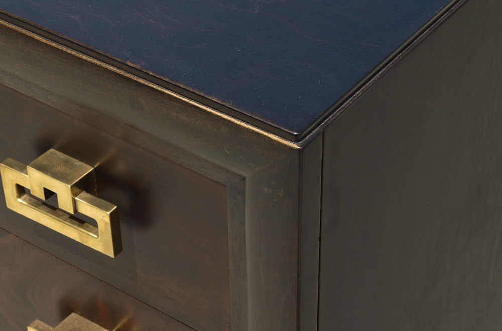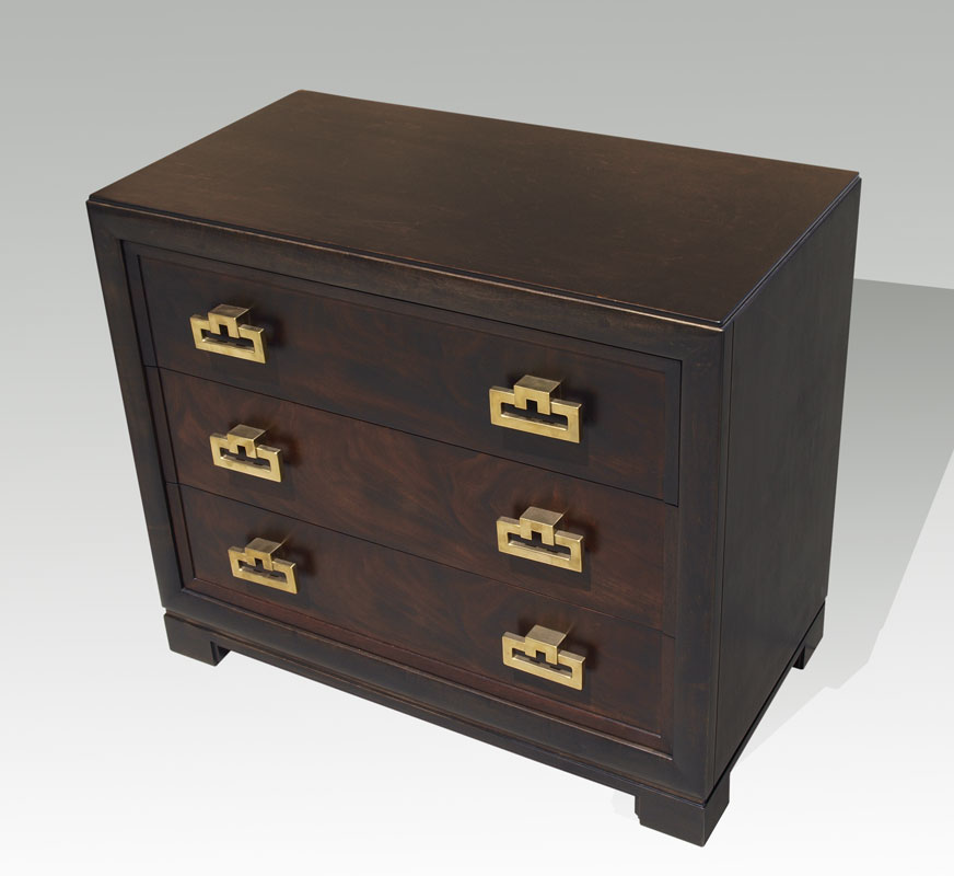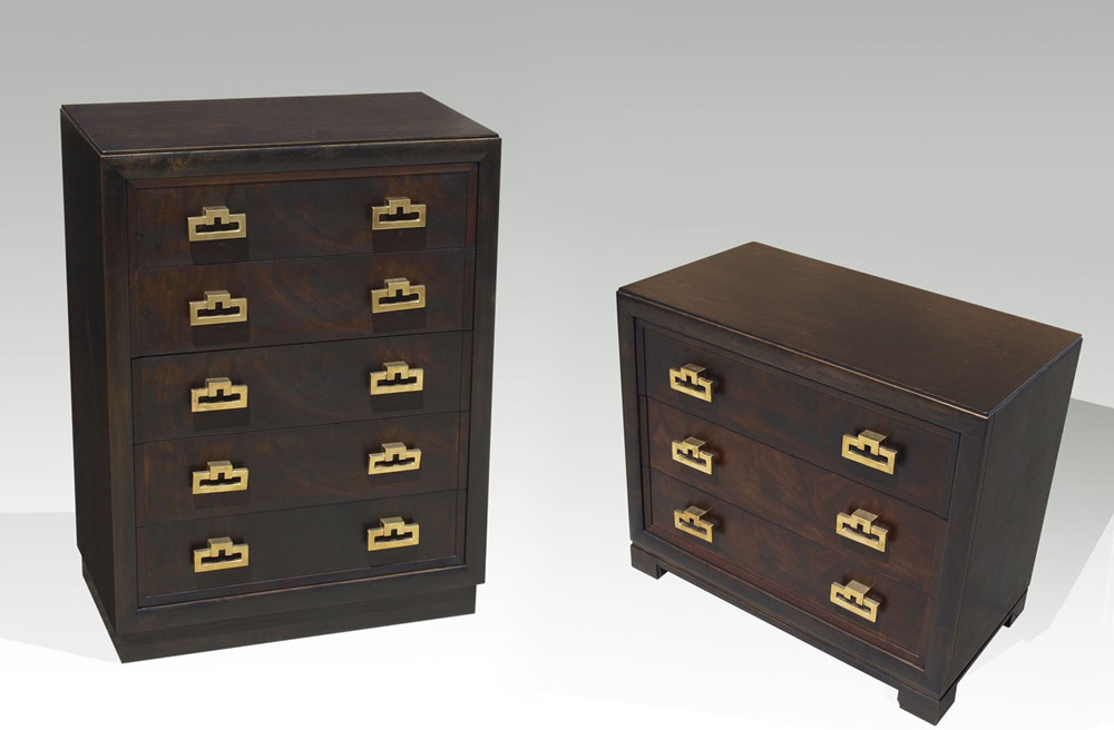 MID CENTURY KITTINGER TALL CHEST AND DRESSER: Marked Kittinger inside drawer, each with heavy brass pulls. To include 5 drawer tall chest 48 1/4'' h. x 21'' x 36'', 3 drawer dresser 33 1/4'' x 39'' x 20 3/4''.