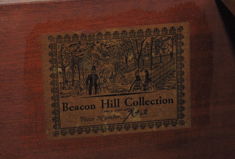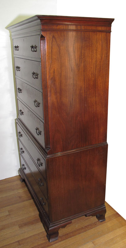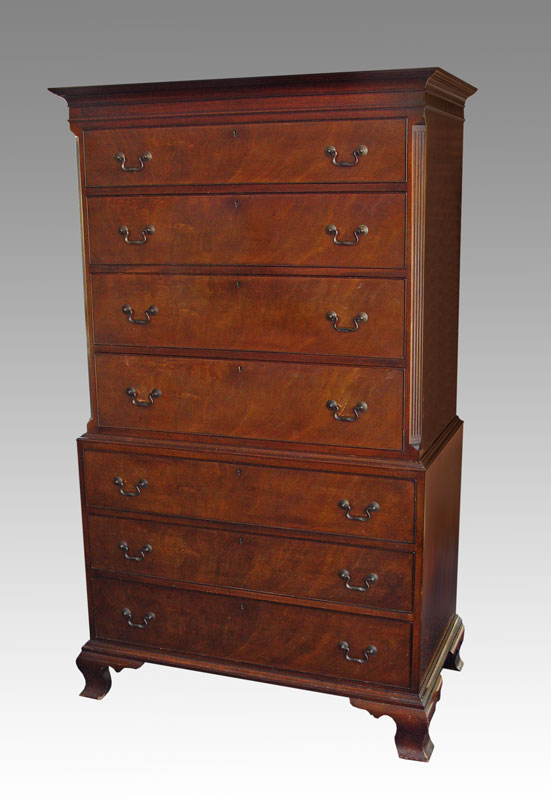 BEACON HILL MAHOGANY 7 DRAWER CHEST ON CHEST: Two parts. 4 drawer top with fluted corner accents over 3 drawer base with bracket feet. Patinated metal pulls. 66'' x 40'' x 21 1/2''.