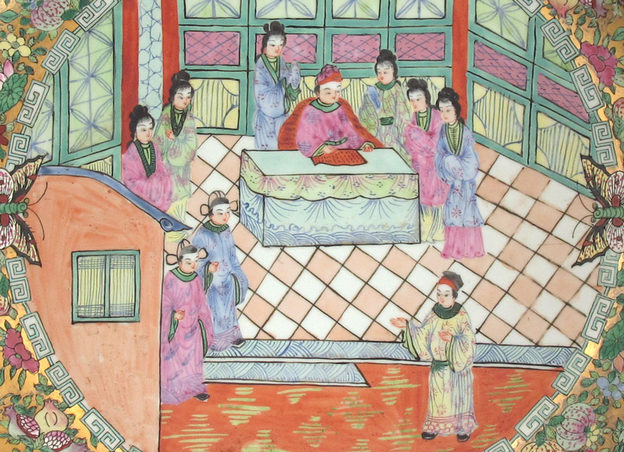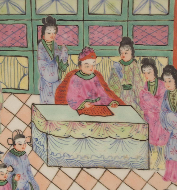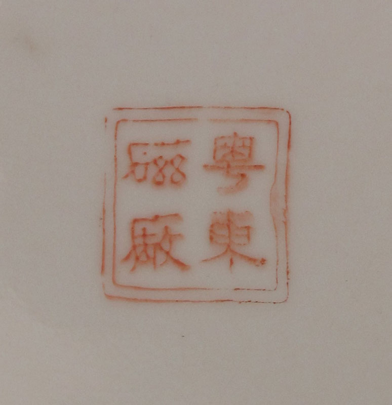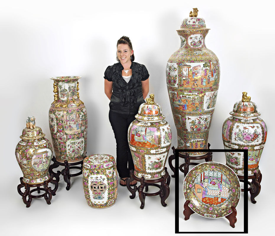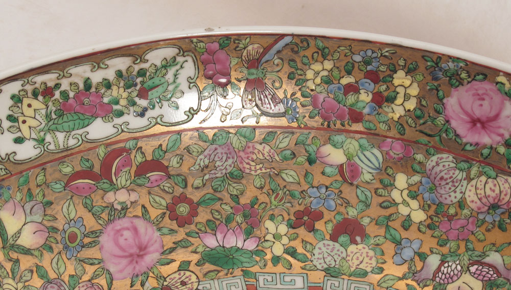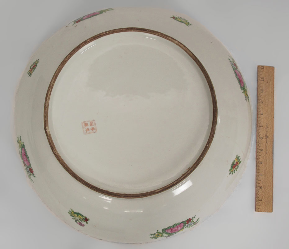CHINESE ROSE MEDALLION BOWL: Or charger, Approx. 20'' dia., 4 1/2'' deep. Sold with the wood stand.