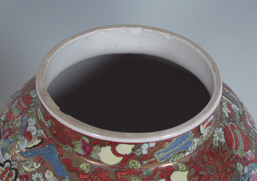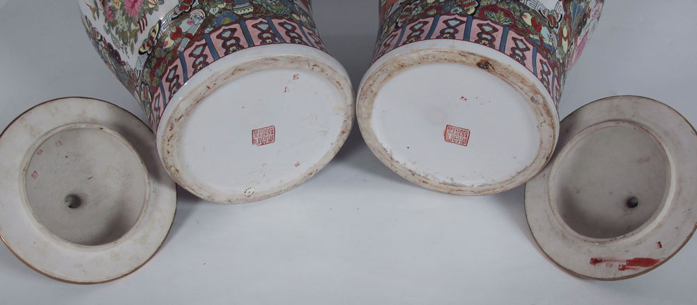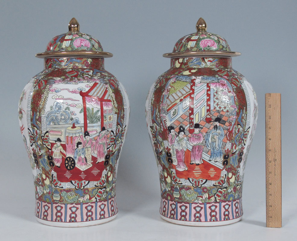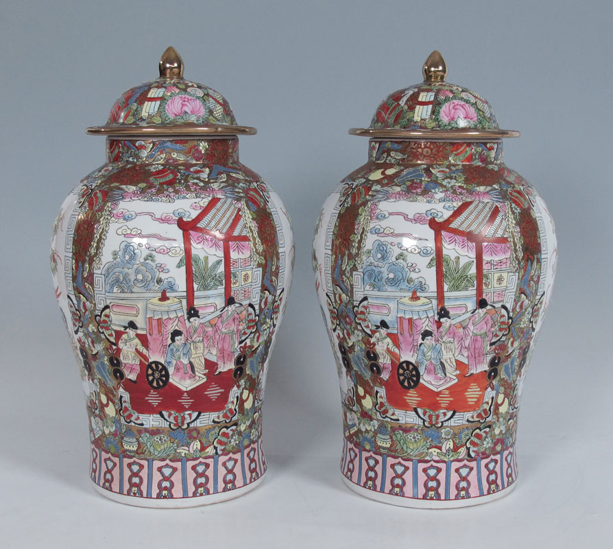 PAIR OF CHINESE ROSE MEDALLION COVERED JARS: 19''h.
