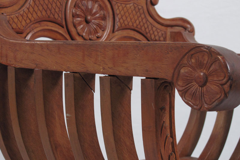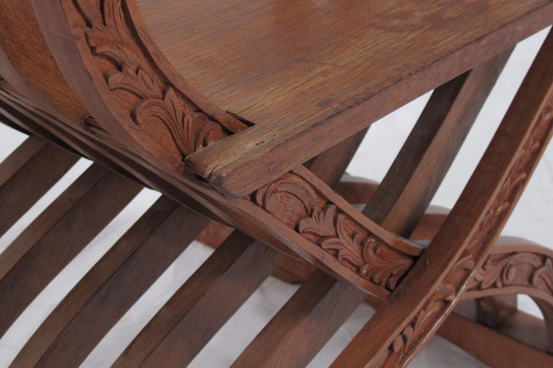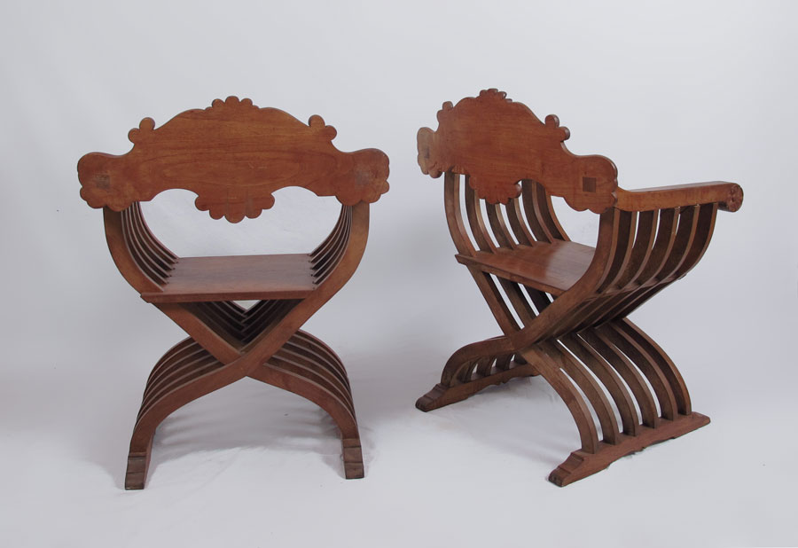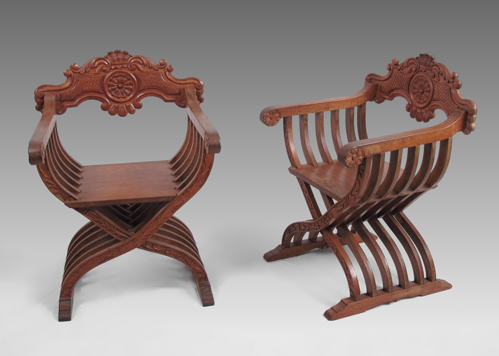 PAIR OF NARRA WOOD SAVONAROLA CHAIRS: Carved crest and hand holds, approx. 35'' tall x 24 1/2'' x 19 1/2''.