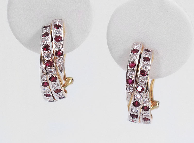 ITALIAN RUBY AND DIAMOND TRIPLE HOOP EAR CLIPS: 18K yellow gold hoop type earrings with 28 round shaped mixed cut rubies, approx. total .70 Ct. There are also 30 round brilliant cut diamonds, approx. .50 Ct., VS in clarity and G-H-I color. Diamonds and rubies ae bead set. Post and hinged clip closures. Weight 8.4 grams. Sold with current Atlanta Gemological GIA graduates appraisal for $2,350.