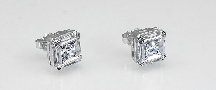 14K WHITE GOLD DIAMOND STUD EARRINGS: 14K white gold earrings contain tow old European round cut diamonds. Weight: .60 Ct. Approx. Rated I1 in clarity and K-L in color. Post and nut closures. The diamonds are prong set. Weight: 3.4 grams.