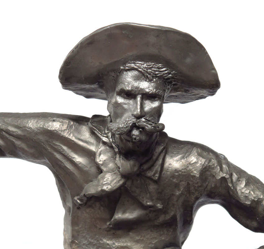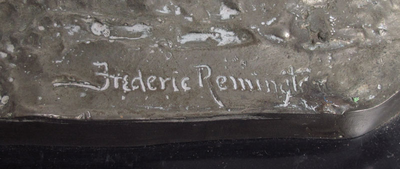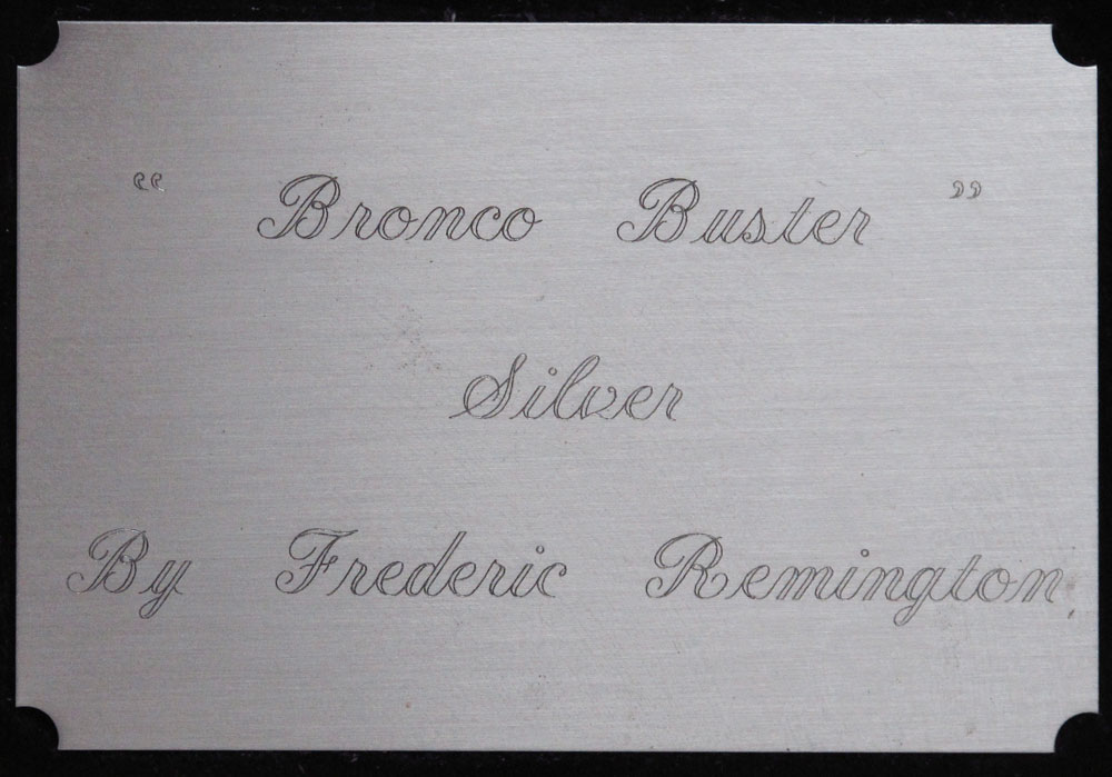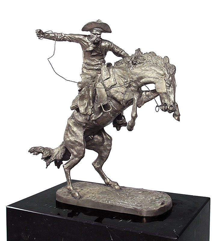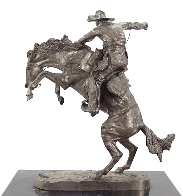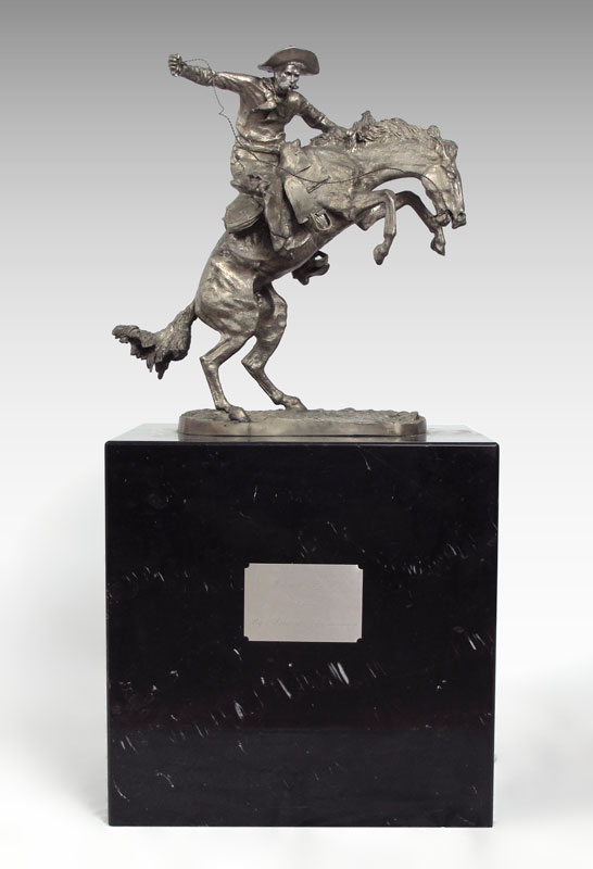 AFTER REMINGTON SILVER CLAD BRONCO BUSTER STATUE: Silver clad casting, statue measures 20 1/2'' h. x 19'' x 9''. Affixed to black marble plinth, overall 41'' h. x 20'' x 14''. Actual metal content unknown.