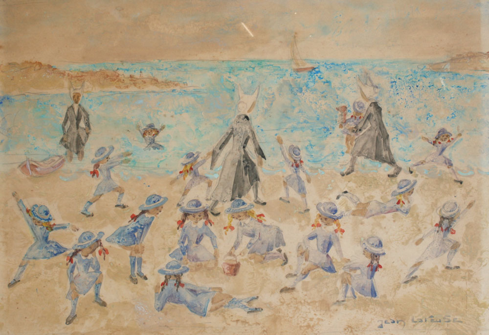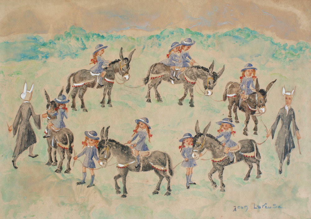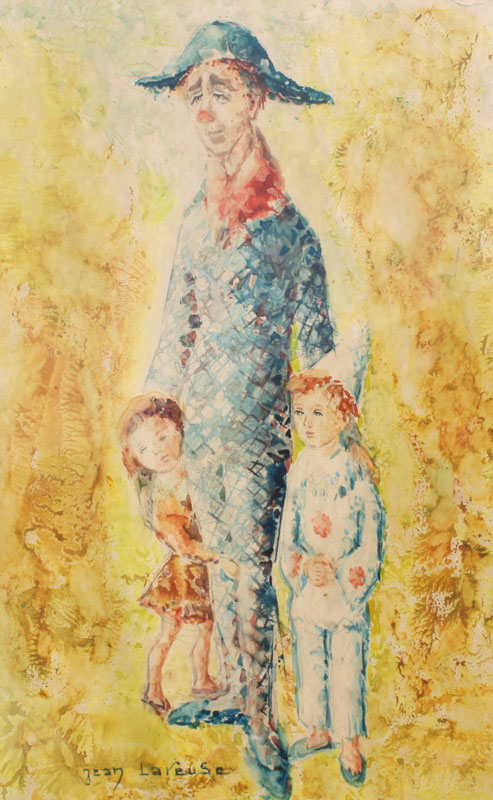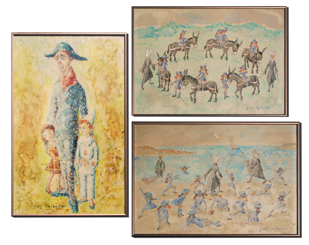 LAREUSE, Jean, (French, 1925-): 3 piece lot of Watercolors 1) Harlequin Children, 27 1/2'' x 17 1/2'', signed lower left, contemporary metal frame, 28 1/2'' x 18 1/2''; 2) Nuns with Children Riding Donkeys, site size 17'' x 23 1/2'', signed lower right, contemporary metal frame, 18 1/2'' x 24 1/2''; 3) Nuns with Children Playing at the Beach, site size 14 1/2'' x 21 1/2'', signed lower right, contemporary metal frame, 15'' x 22 1/2''.