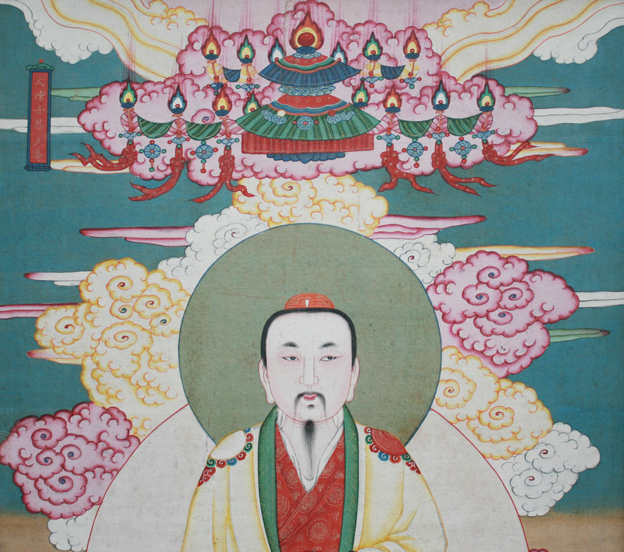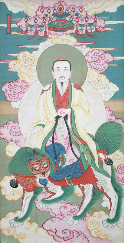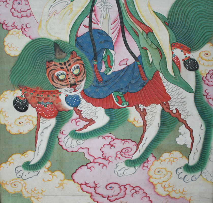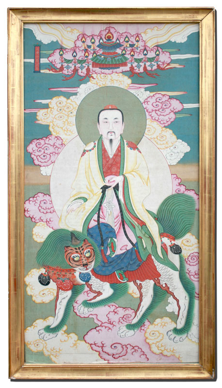 CHINESE PAINTING ON SILK OF ROYAL RIDING TIGER, PROBABLY LATE 19TH C.: Sight size 58'' x 29 1/2'', no visible signature, encased in worn gilded frame, 64'' x 34 1/2''.