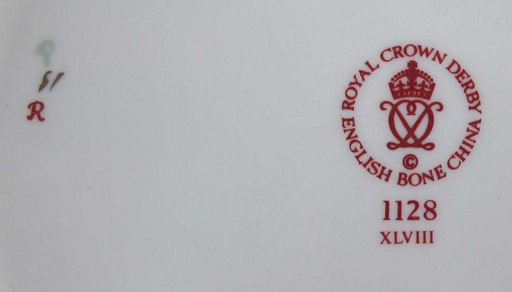 ROYAL CROWN DERBY CHINA 1128: Approx. 40 pieces to include 8 dinner plates (10 1/4''), 8 salad plates (8 1/2''), 8 bread plates, and 8 cups and saucers.