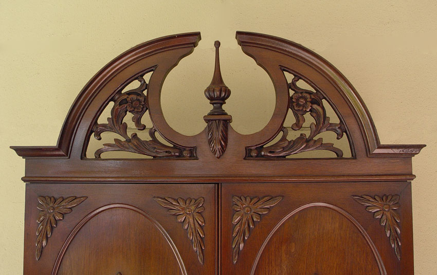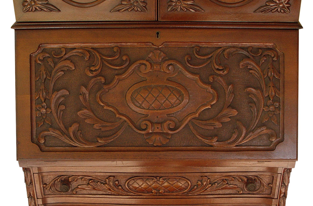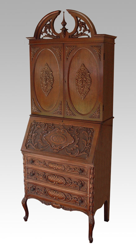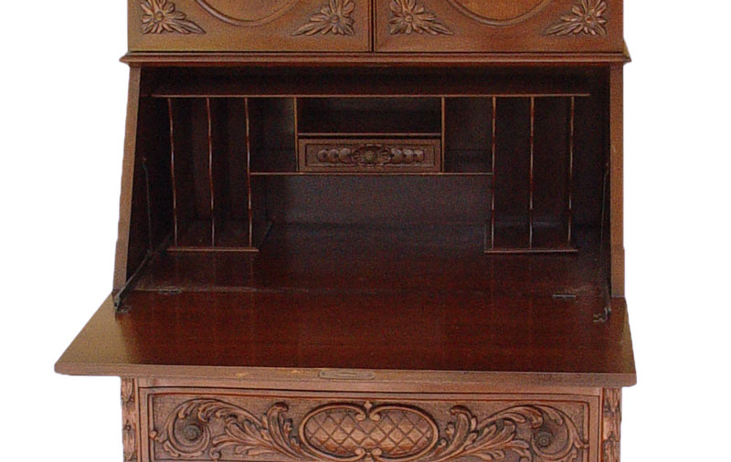 PROFUSELY CARVED WALNUT SECRETARY BOOKCASE: Relief carved double doors bookcase top, the interior of the desk with removable cubicles and drawers. Three full length drawers, also with overall carving. Measures 76'' tall x 29'' x 17''.