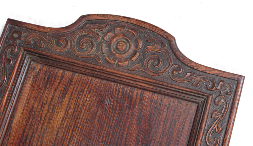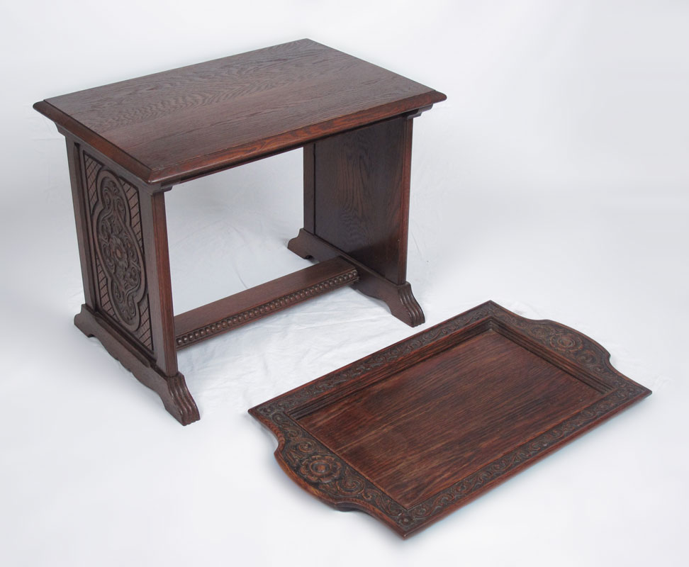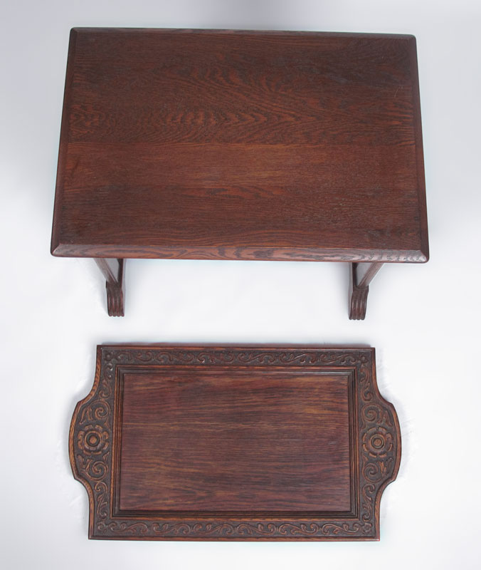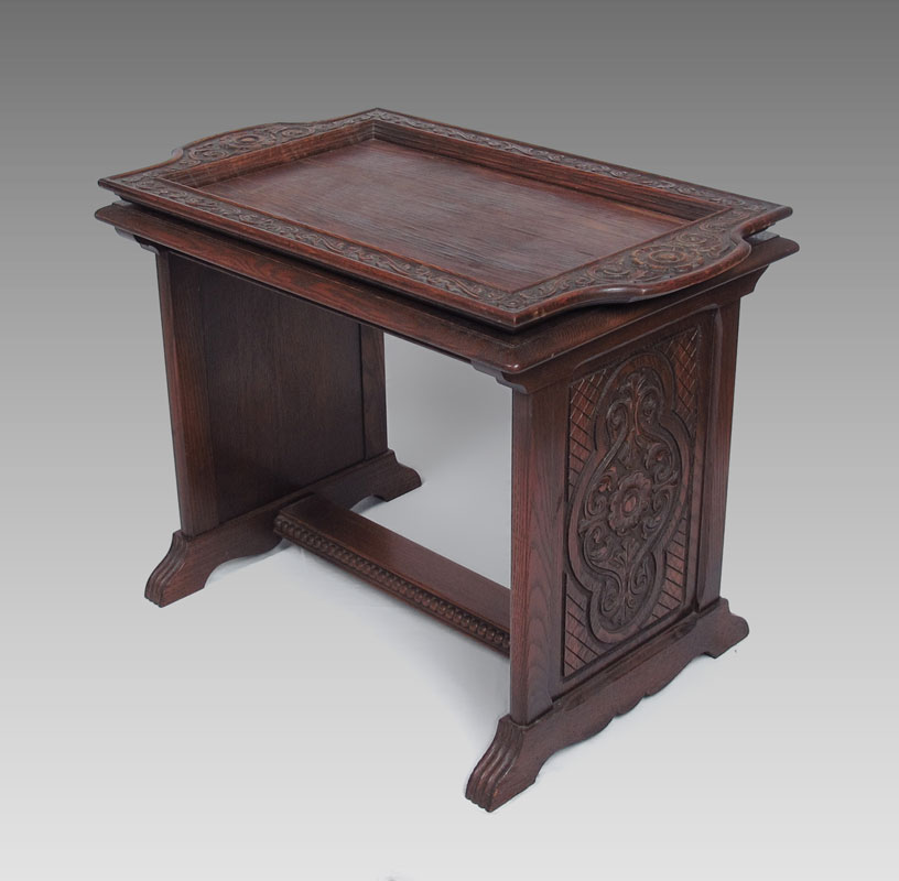 1920's CARVED OAK TEA TABLE: The lift tray framed in relief carvings. Carved side panel legs joined by stretcher. Measures approx. 20' x 26'' x 18''.