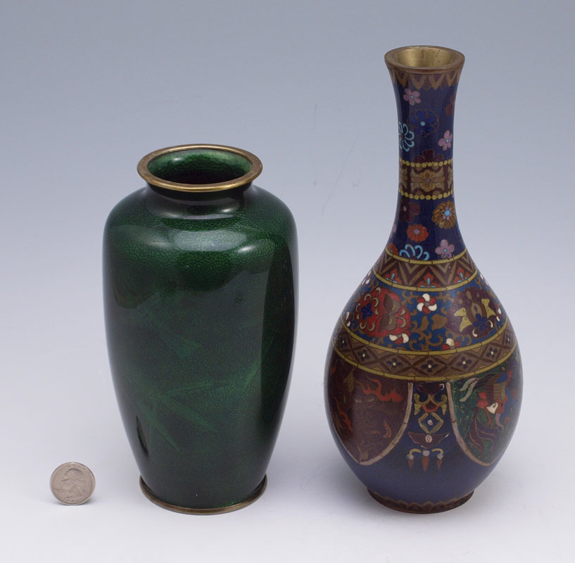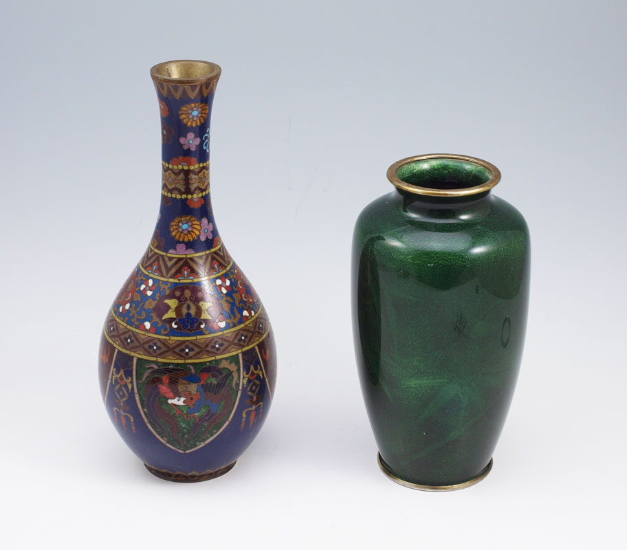 TWO STYLES OF JAPANESE CLOISONNE VASES: 1) Green wireless in a bamboo design, 7 1/4'' tall. 2) Polychrome enameled bottle neck vase, 9 1/2''.
