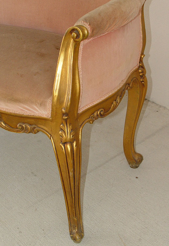 FRENCH GILT WOOD CANAPE / SETTEE: Louie XVI style, Scrolling top rail centered by a carved crest, slightly scrolling arms, carved skirt classic cabriole legs. Worn gold finish, the velvet upholstery is also worn. 39 1/4'' h. x 47'' x 18''