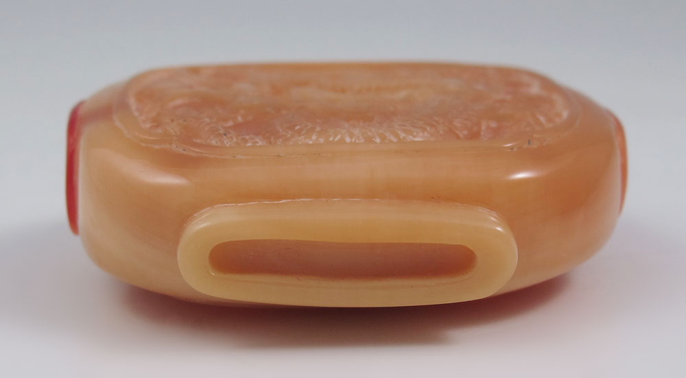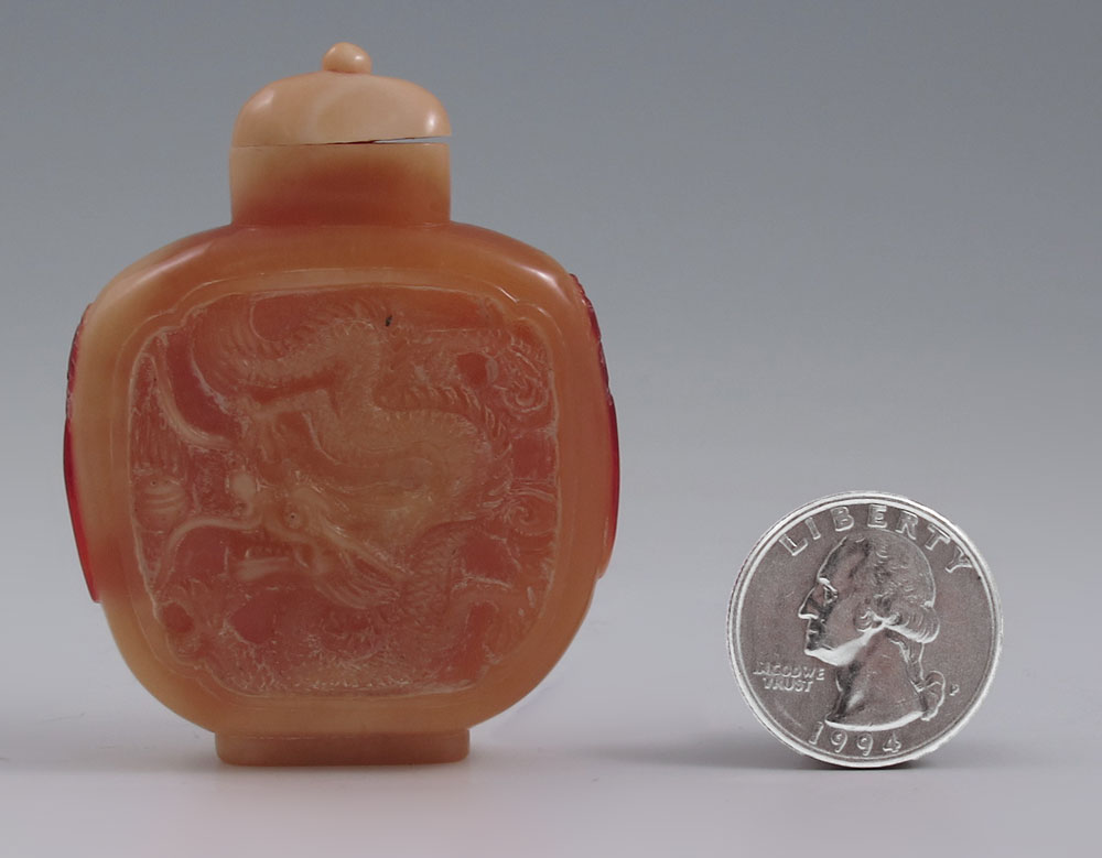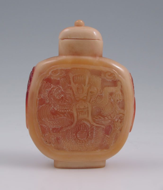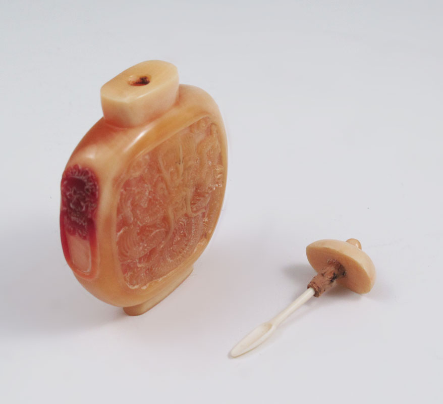 CHINESE CARVED HORNBILL SNUFF BOTTLE: Depicting dragons or serpents, with ivory spoon. 2 3/8'' h. x 1 7/8''.