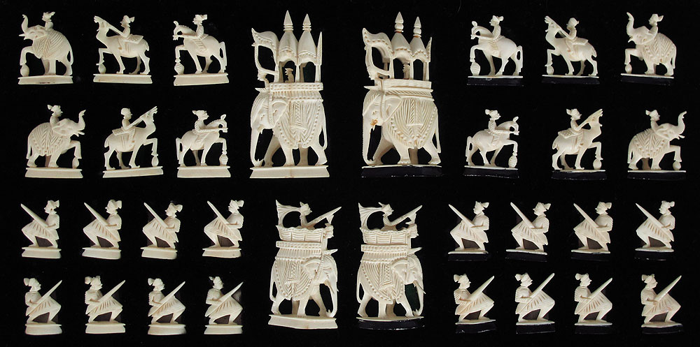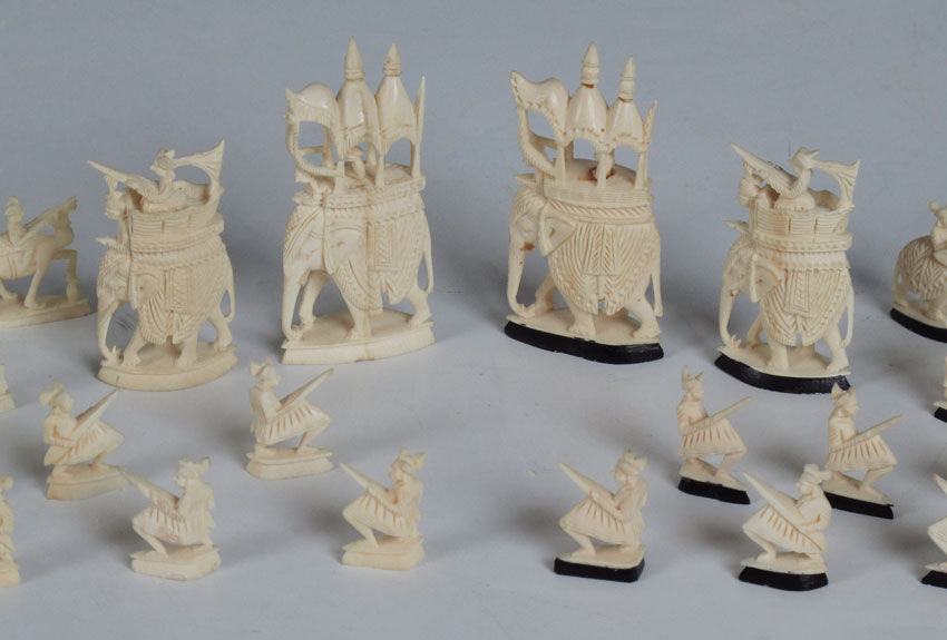 CHINESE CARVED IVORY CHESS SET: Complete set featuring carved elephants, animals and figures. Kings are carved elephants with caravan and figure, measures 3 3/8'' h. Sold with case, 1 3/8'' h. x 15'' x 8''.