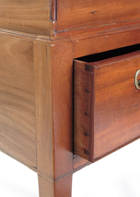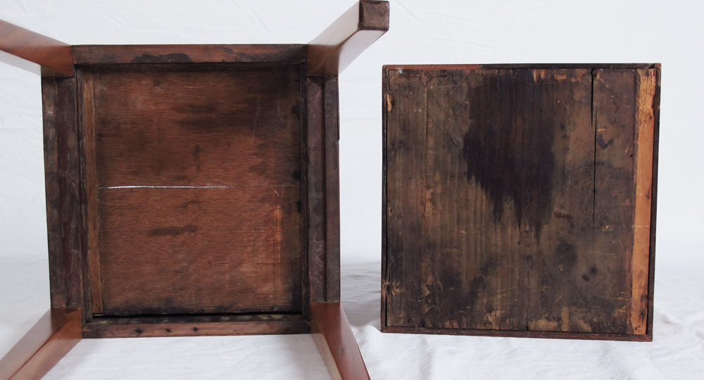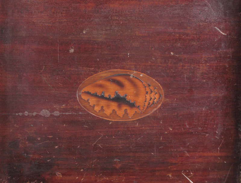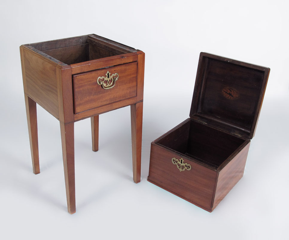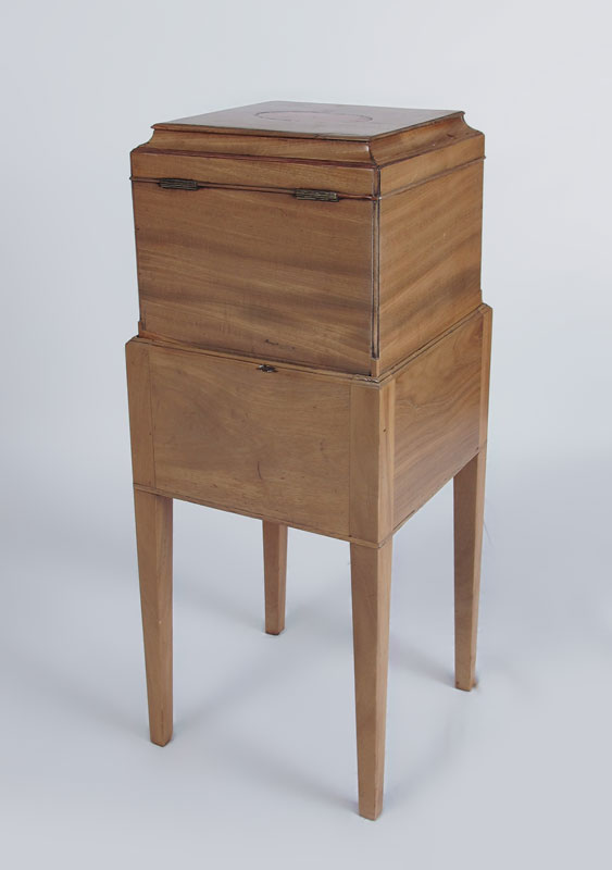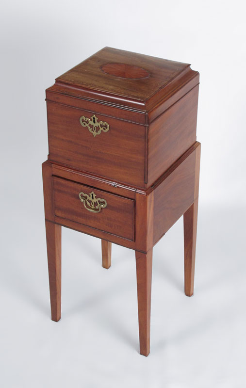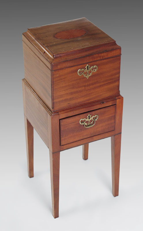 ANTIQUE CELLARET BOX ON STAND: Pantera inlay on top and design of shell inlay to interior of the hinged top. The drawer in the stand and the box are key locking. Satinwood and mixed woods. On stand measures 27 1/2'' tall x 11'' x 11''.
