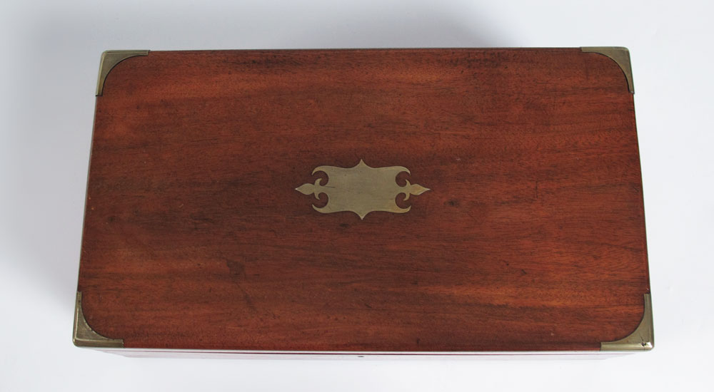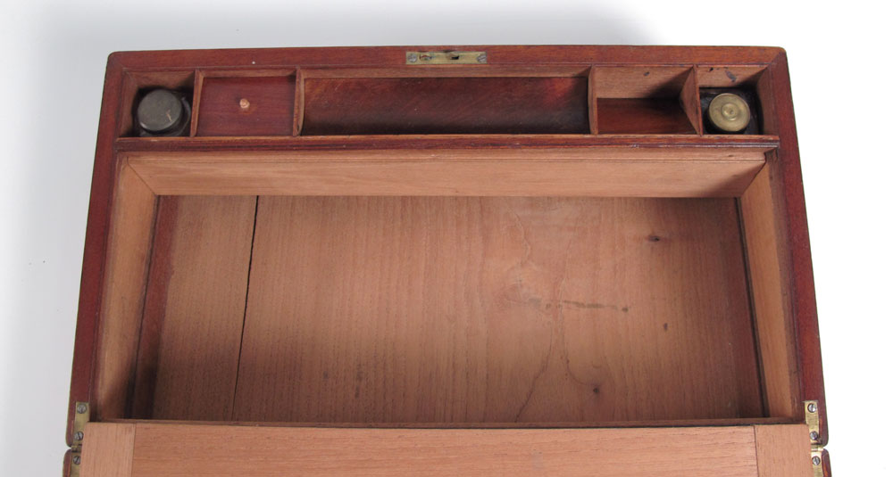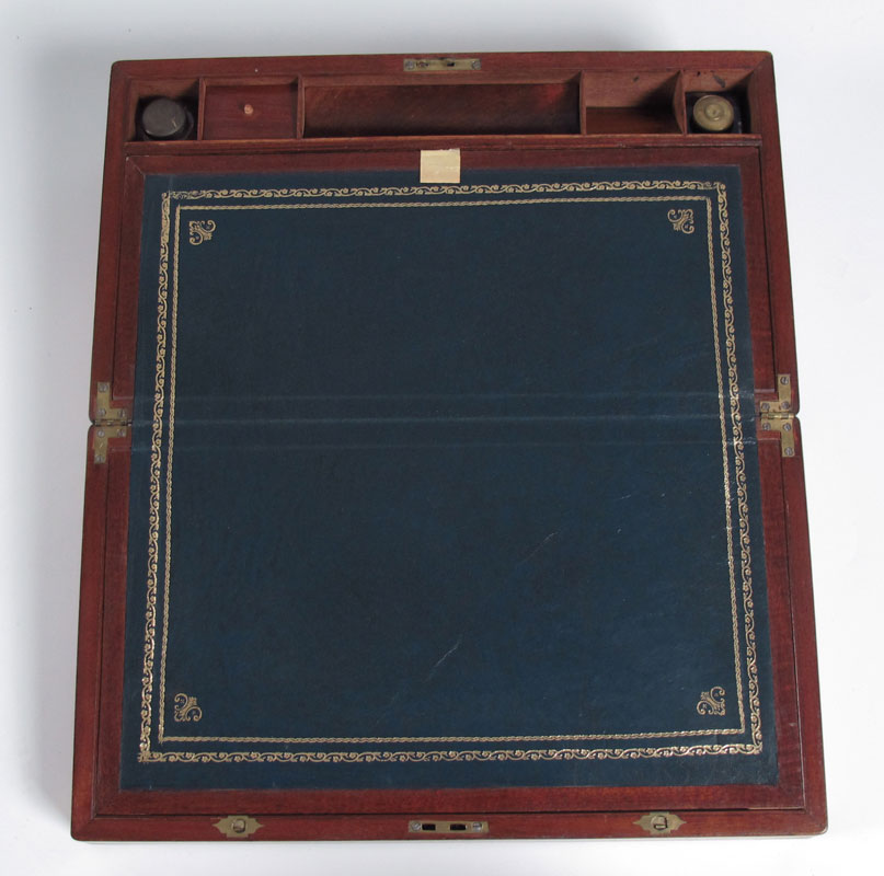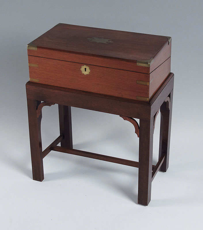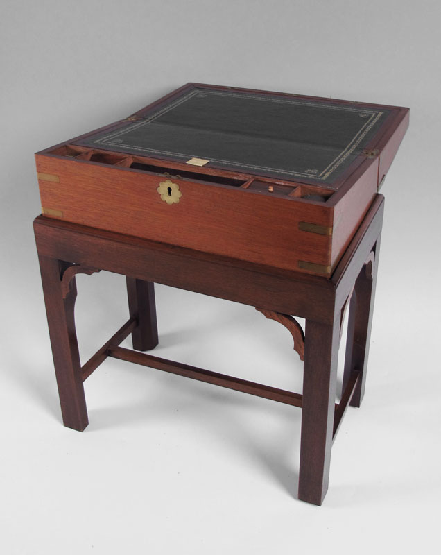 19th C. LAP OR TRAVEL DESK: Compartmented interior, with ink bottles. Brass mounts on the corners. The embossed leather top may be later, the stand is later. Box is approx. 9 3/4''h. x 6'' x 17 1/2''.