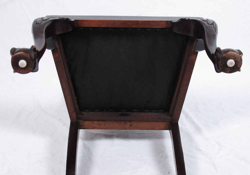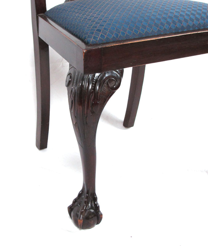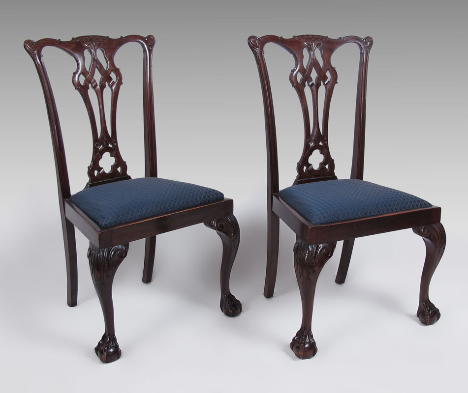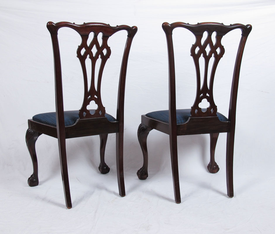 PAIR CENTENNIAL CHIPPENDALE CHAIRS: Pierce backs, ball and claw front feet, straight skirt. Approx. 40'' h. x 20'' x 18''.