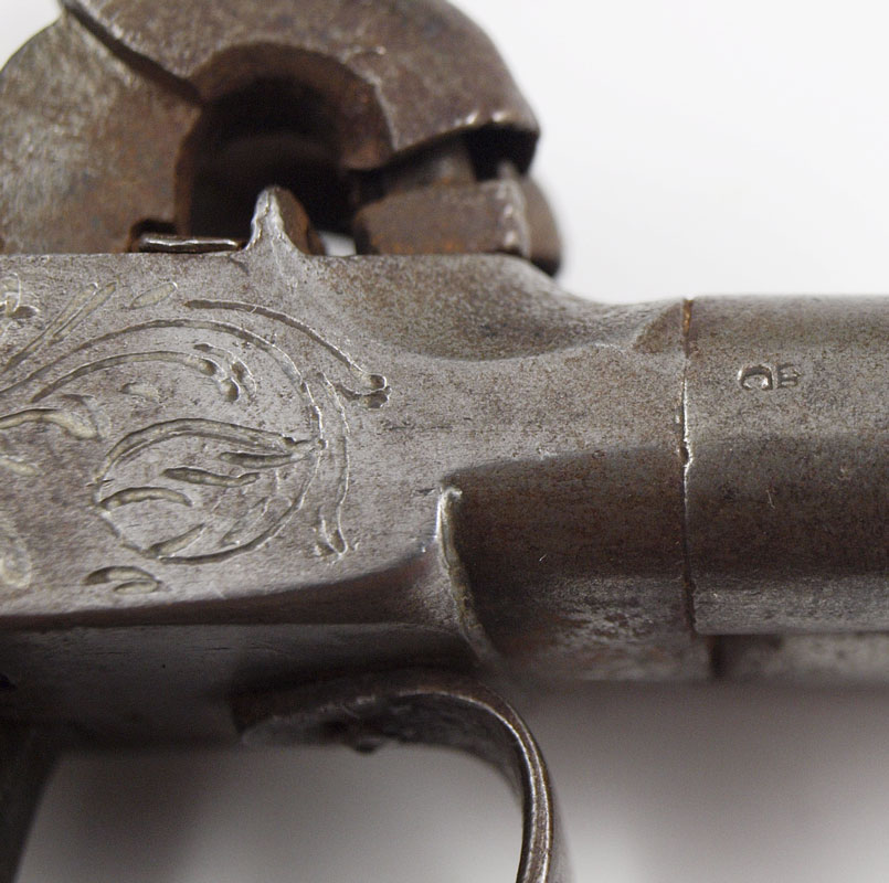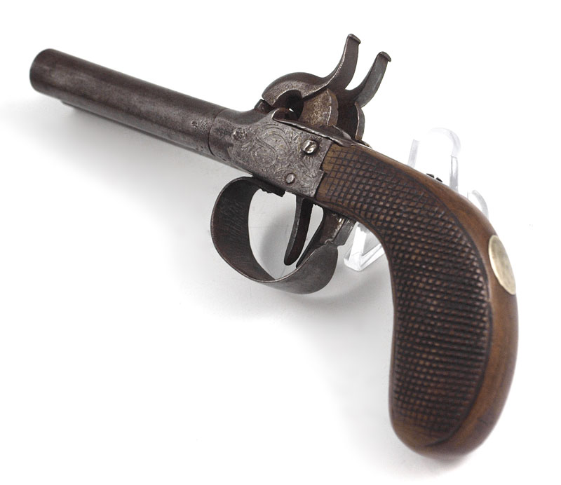 BELGIAN DOUBLE BARREL PERCUSSION BOOT PISTOL: Engraved frame with Belgian proof marks on frame. 3 1/4'' barrels. Action works fine one barrel, does not hold on other. Checkered wood grips. 7 3/8'' overall.