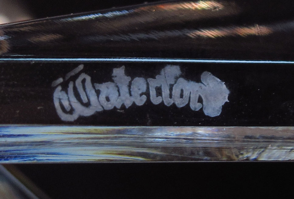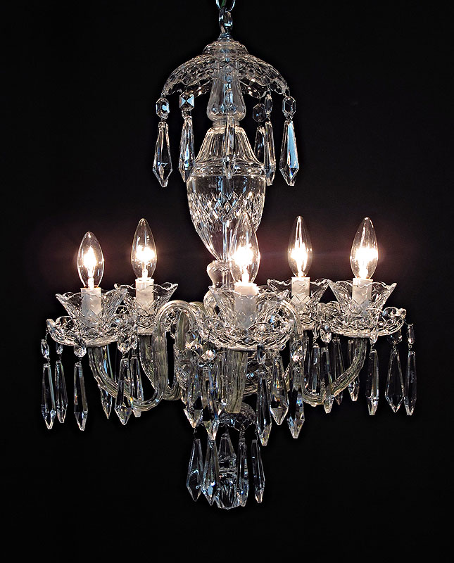 A PETITE WATERFORD CRYSTAL CHANDELIER: Five light signed Waterford chandelier with gracefully curved bent arms, signed, Approx. 20'' h. x 16''.