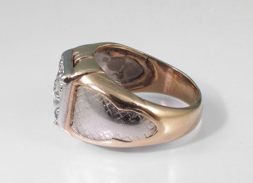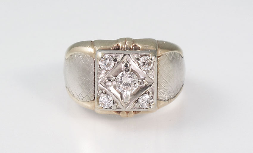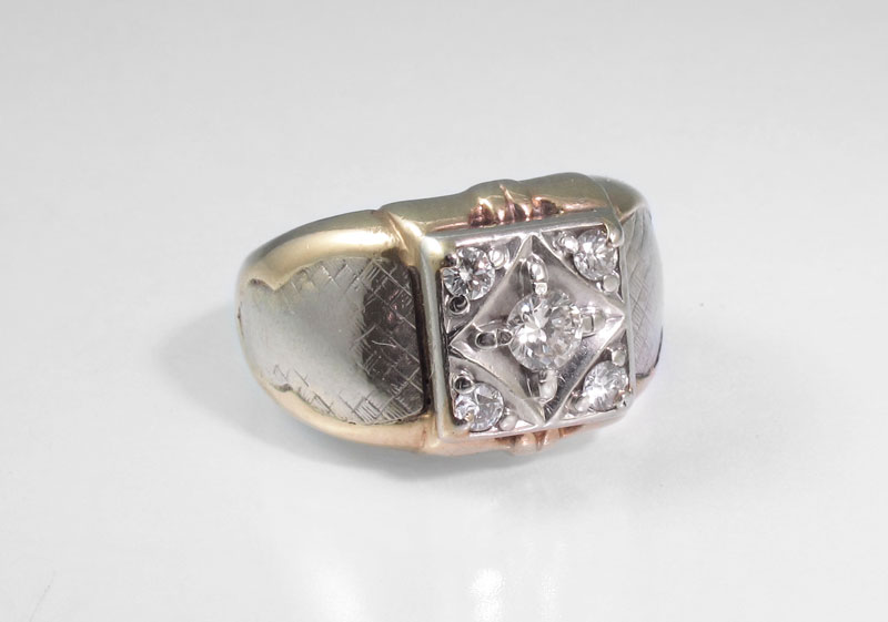 MAN'S TWO TONE GOLD DIAMOND RING: 10K yellow gold man's ring contains five round brilliant cut diamonds Weight: .50 Ct. Approx. Rated VS-SI in clarity and H-I in color. The diamonds are prong set. Weight: 8.1 grams. Size: 8