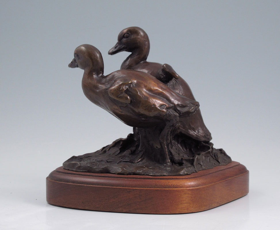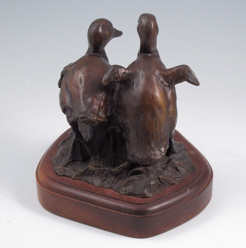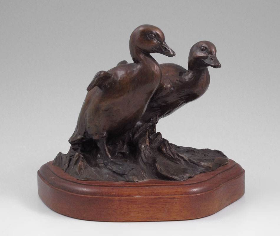 GOODNIGHT, Veryl , (American, 1947-): ''The Goslings'', Bronze?, 4 1/4'' in height by approximately 5 1/2'' wide, has incised signature, dated 1980 and numbered 16 of 30, original gallery documentation/COA from the Veryl Goodnight Studios included, affixed to a beveled wooden plinth, 5 1/2'' height x 6 1/4'' width overall.