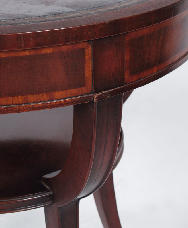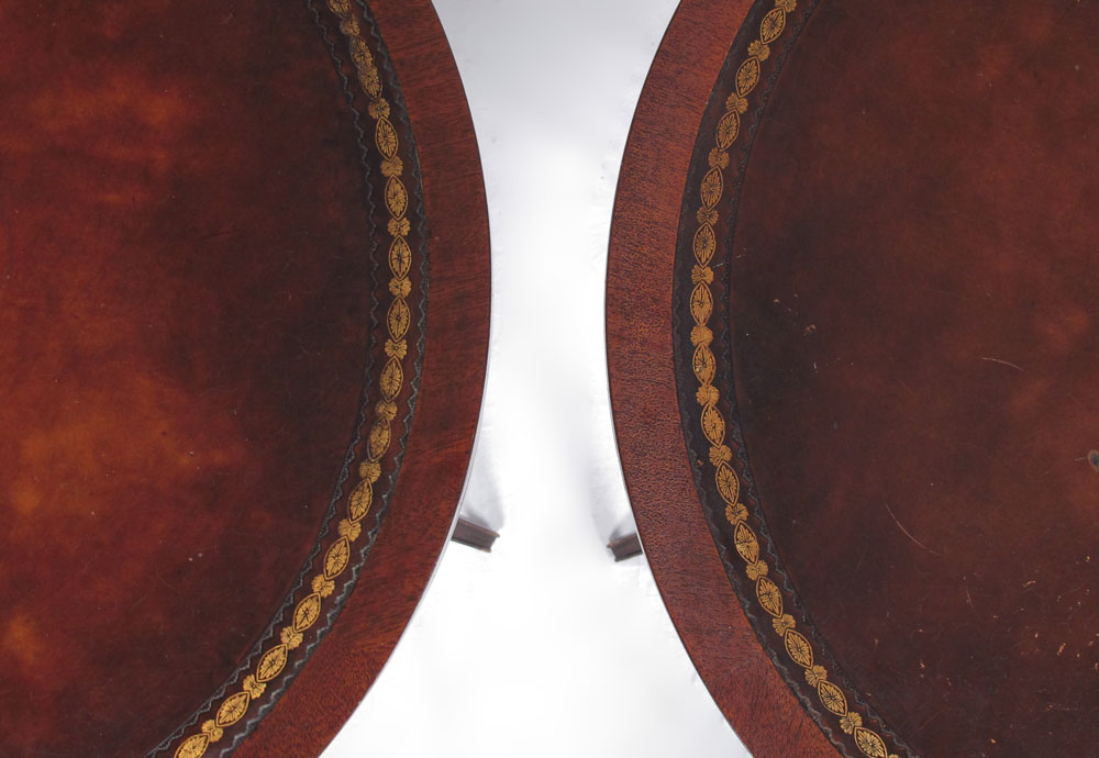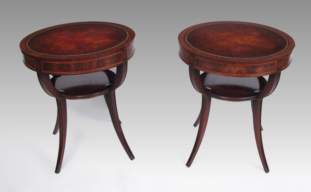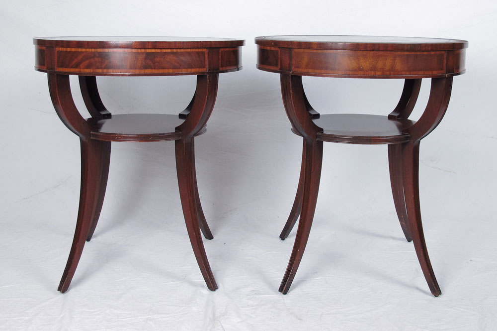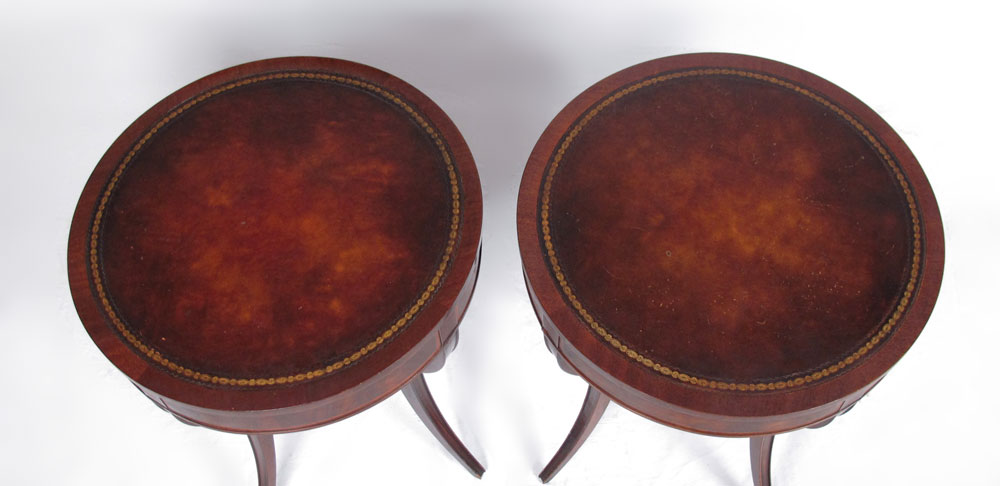 PAIR WEIMAN MAHOGANY LAMP TABLES: Leather top, two tier side tables. Branded Weiman. 27'' x 24'' dia.