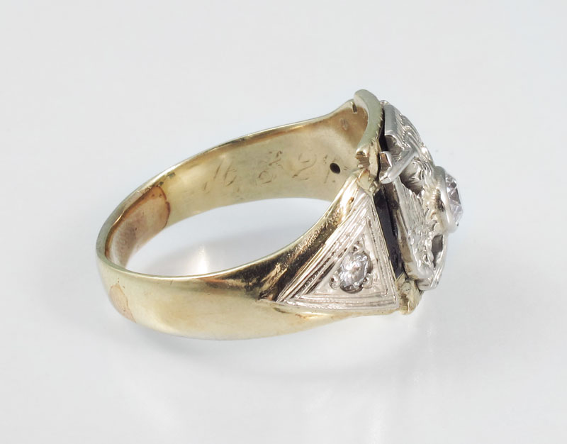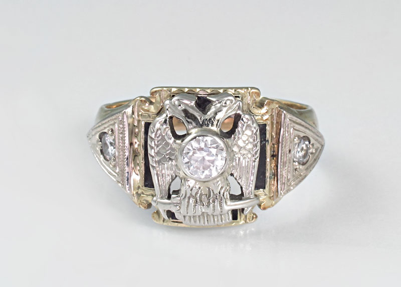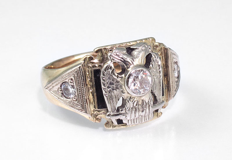 SCOTTISH RITE MASONIC DIAMOND RING: 14K yellow gold fraternal ring centering an eagle with three round brilliant cut diamonds, all totaling .50 Ct. Approx. The diamonds average VS-SI in clarity and G-H-I in color. The diamonds are bezel and bead set. Weight: 10.3 grams. Size: 11.