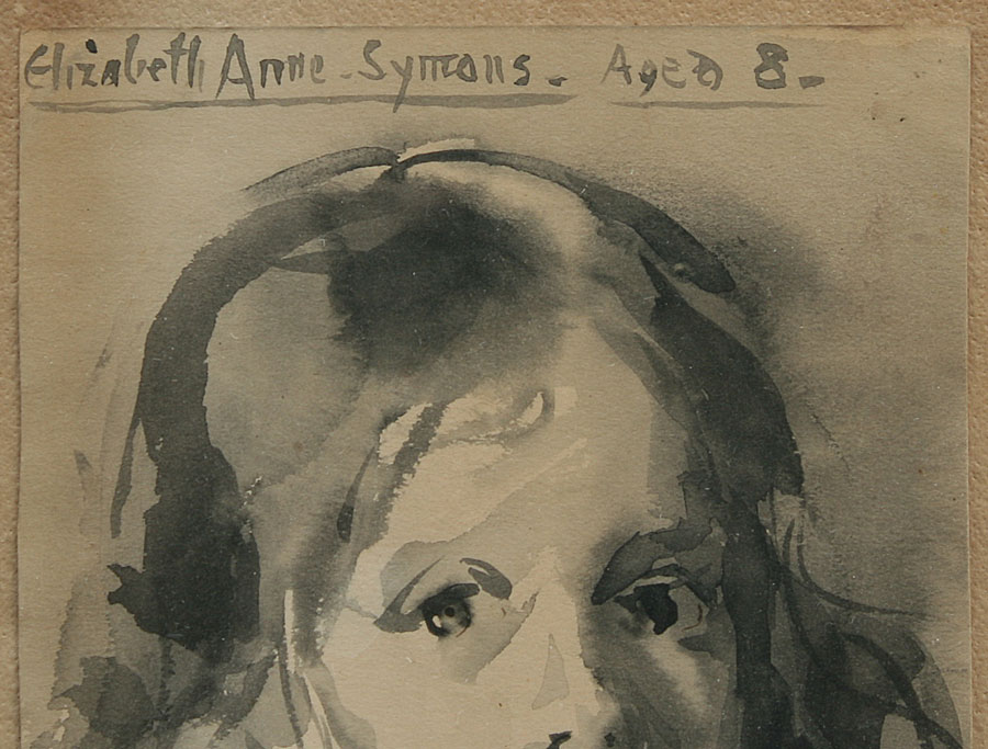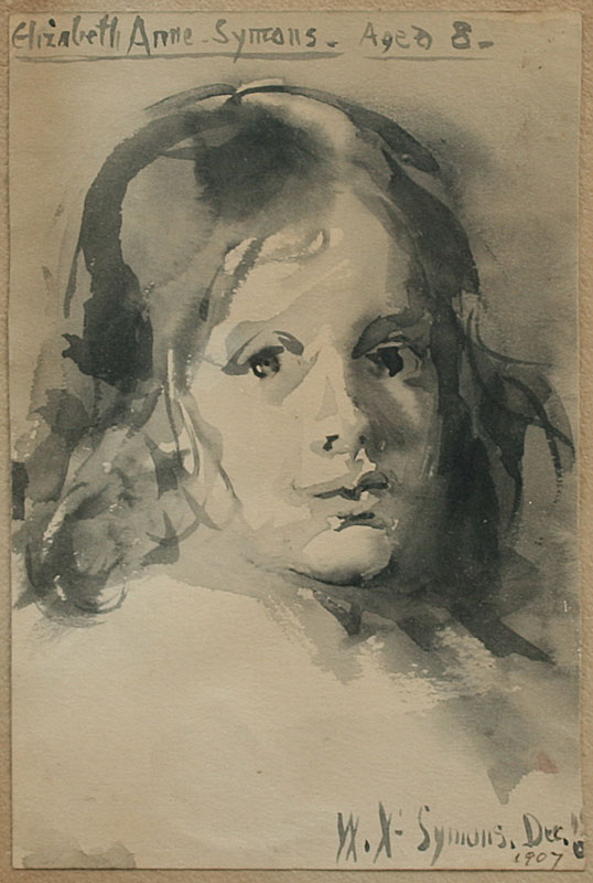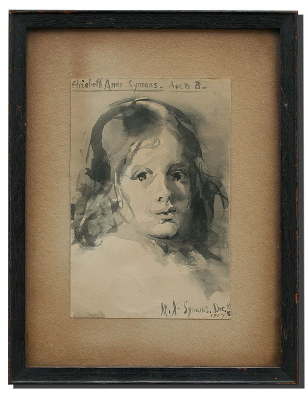 SYMONS, William Christian, (American, 1845-1911): ''Elizabeth Anne Symons, Aged 8'', Watercolor, 7'' x 4 1/2'', signed lower right and dated December 11, 1907, titled in the upper margin, worn black frame, 10 3/4'' x 8 1/2''.