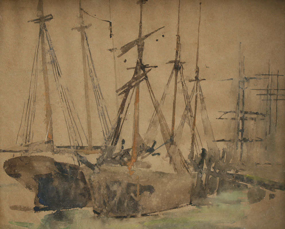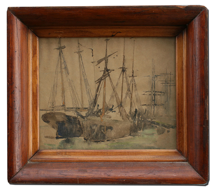 SYMONS, William Christian, (American, 1845-1911): ''New Haven, 1897'', Dockside Scene, Watercolor, 9 5/8'' x 11 5/8'', unsigned, titled verso, worn period frame, 13 1/4'' x 15 1/2'', from the estate.