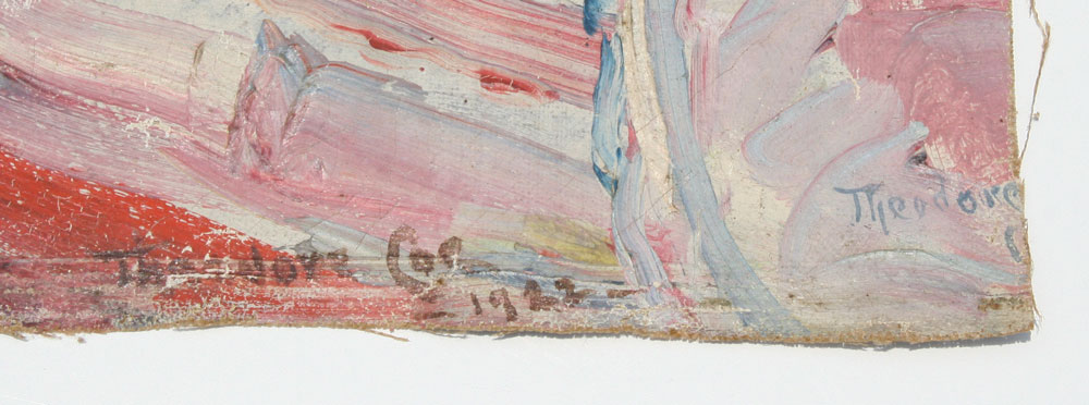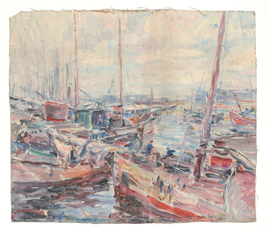 COE, Theodore, (American, 1866-): Busy Dock Side Scene With Boats, Oil/Canvas, 16'' x 19'', signed twice lower right, dated once 1922, unstretched and unframed.